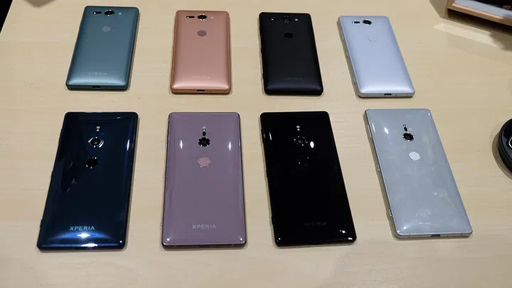Finally, here's a shot of all the different colors for both phones (as you can see, the glass backs of the Xperia XZ2 are a nightmare to keep clean). Which is your favorite?