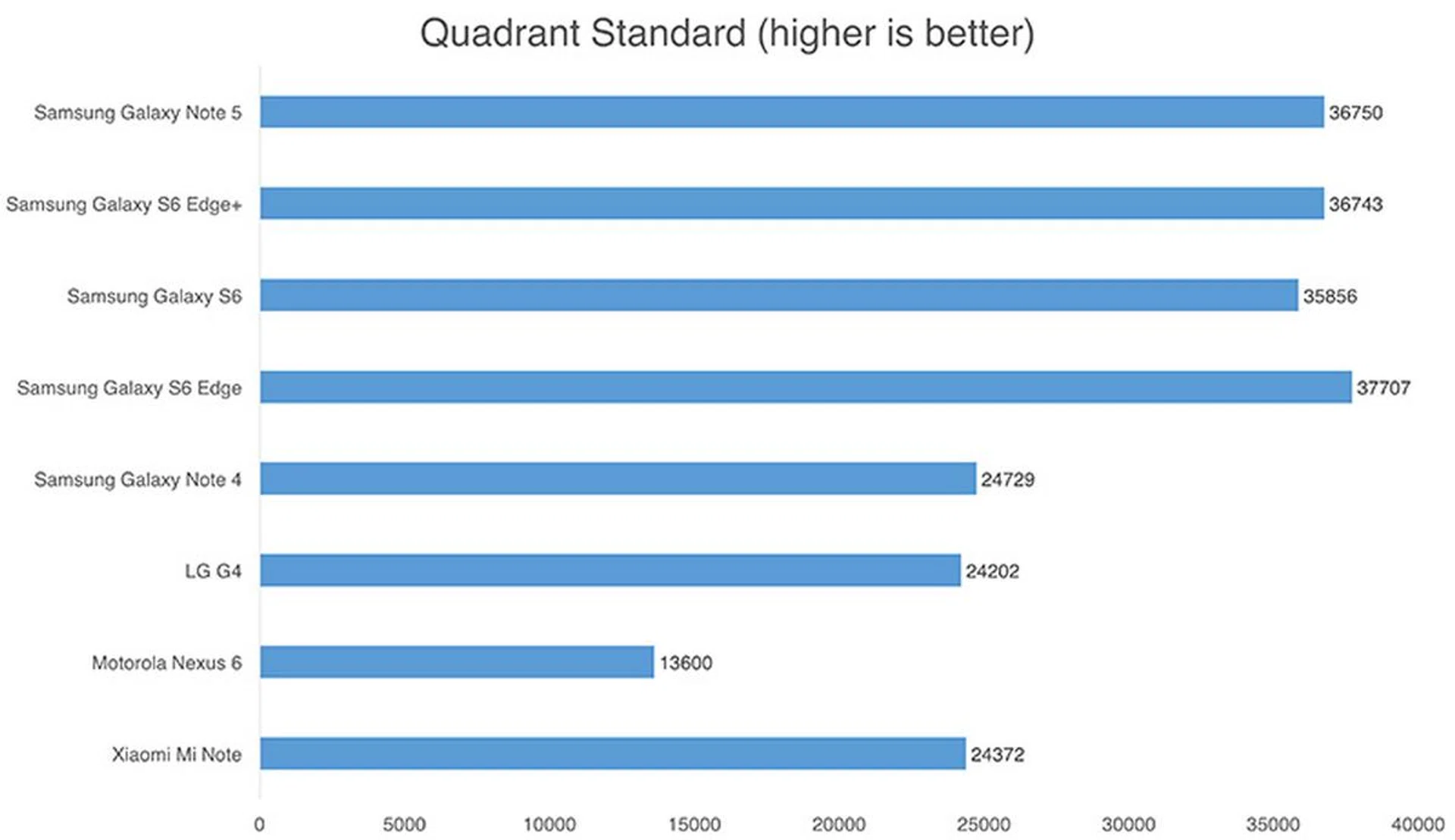 For Quadrant, which evaluates a device’s CPU, memory, I/O, and 2D/3D graphics performance, there’s no surprise that both phablets performed very similar to the S6 models. For another data point, all four Exynos 7420-equipped Galaxy phones posted Antutu scores in the neighborhood of 70,000. Needless to say, the Note 5 blows the Note 4 out of the water thanks to the faster CPU cores, and better memory and NAND performances.