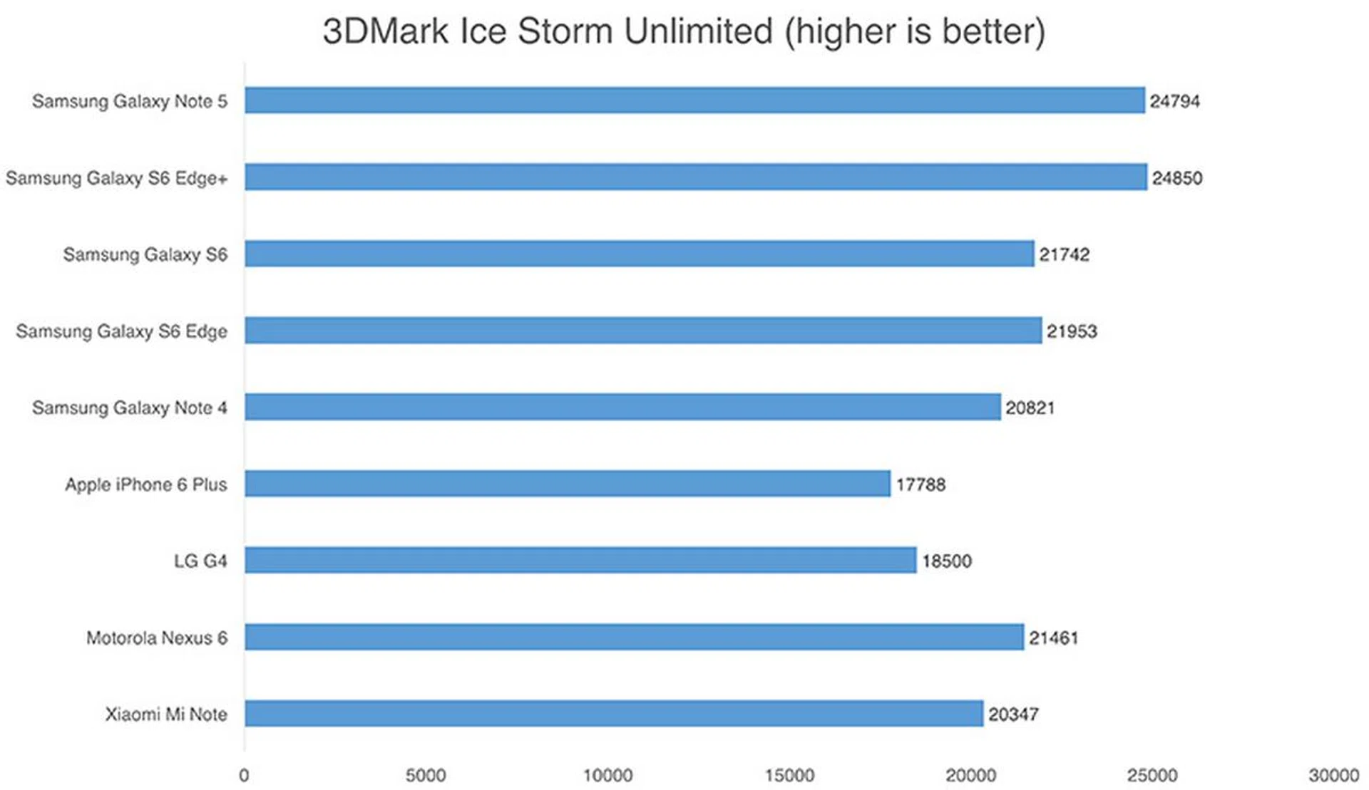 The GPU story is one you’ve heard before, and that is the Exynos 7420’s Mali-T760 MP8 is better than the Mali-T760 MP6/Adreno 420 found in the Note 4’s Exynos 5433/Snapdragon 805, and a strong match (sometimes better) against Snapdragon 810-based phones that use the Adreno 430 GPU, such as the HTC One M9. Which is remarkable really, when you consider that the two phablets have a bigger 1440p display.