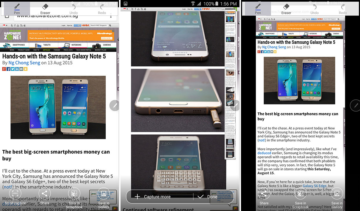 The S Pen on the Note 5 is, however, no gimmick, and is the single most important hardware difference between it and the S6 Edge+, as well as other phablets out there. Scrolling, navigating the UI, highlighting text, taking notes, splitting screens for multitasking - the Note 5/S Pen combo is as much a productivity booster for normal humans like us as a supercharged drawing tool for artists. The spring-loaded S Pen tip is a clever way to avoid drilling an ugly hole at the glass back just so your fingernail can dig the stylus out, and I’ll file that as yet another example Samsung is beginning to understand that little details go a long way.