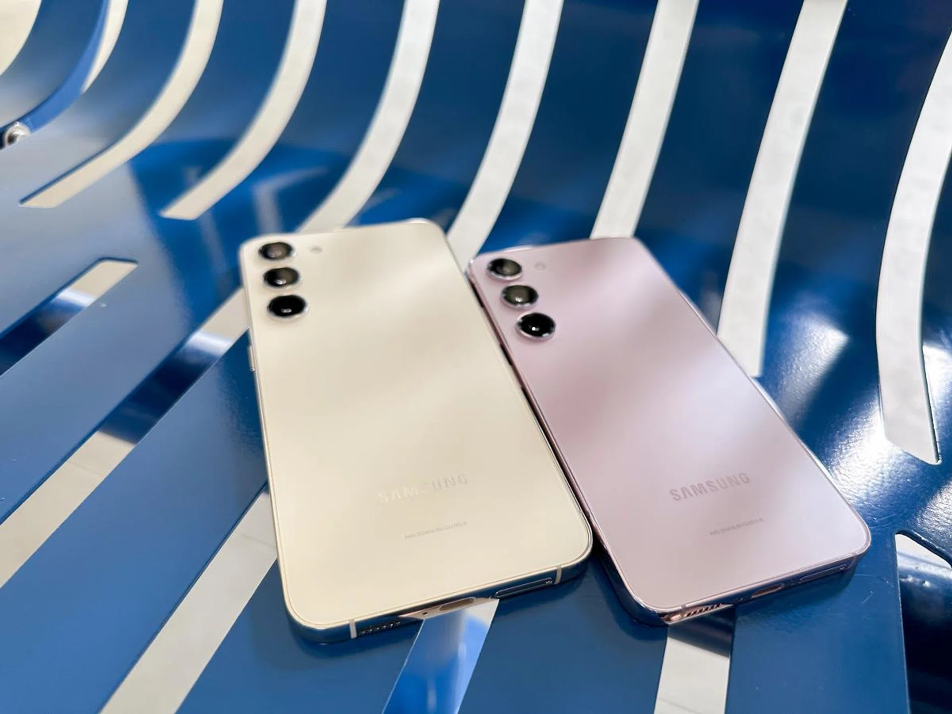 Samsung Galaxy S23 (Lavender, left), Samsung Galaxy S23+ (Cream, right).