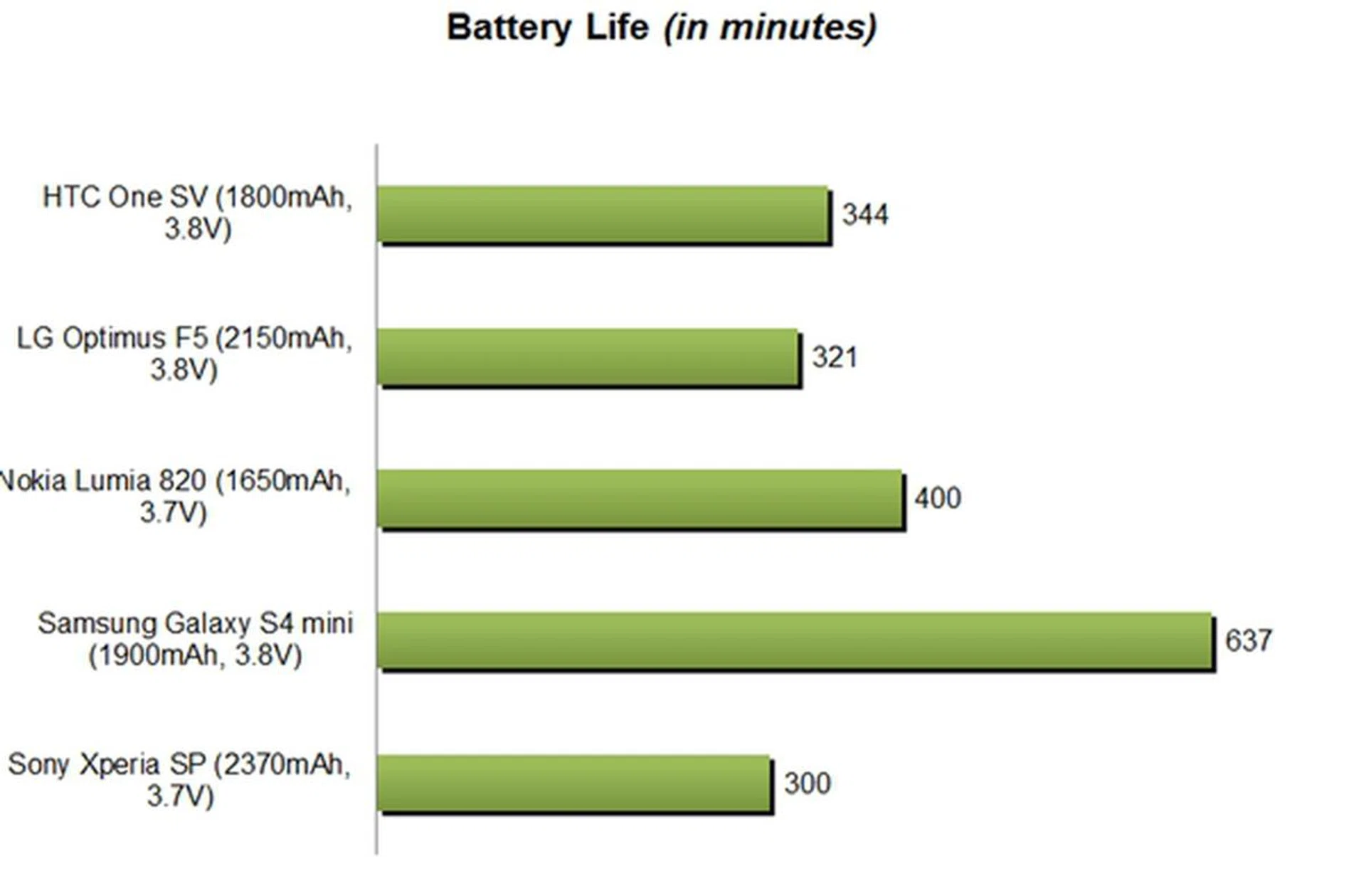 Repeating the Galaxy S4's top-notch battery performance in the 5-inch smartphone segment, the Samsung Galaxy S4 mini managed to come up well ahead of the competition with a chart topping battery uptime of over 10 hours! Peering into its power consumption figures, we can clearly see the Galaxy S4 mini is the most frugal of the lot and a big portion of this lead is thanks to its power efficient Super AMOLED display that it touts.