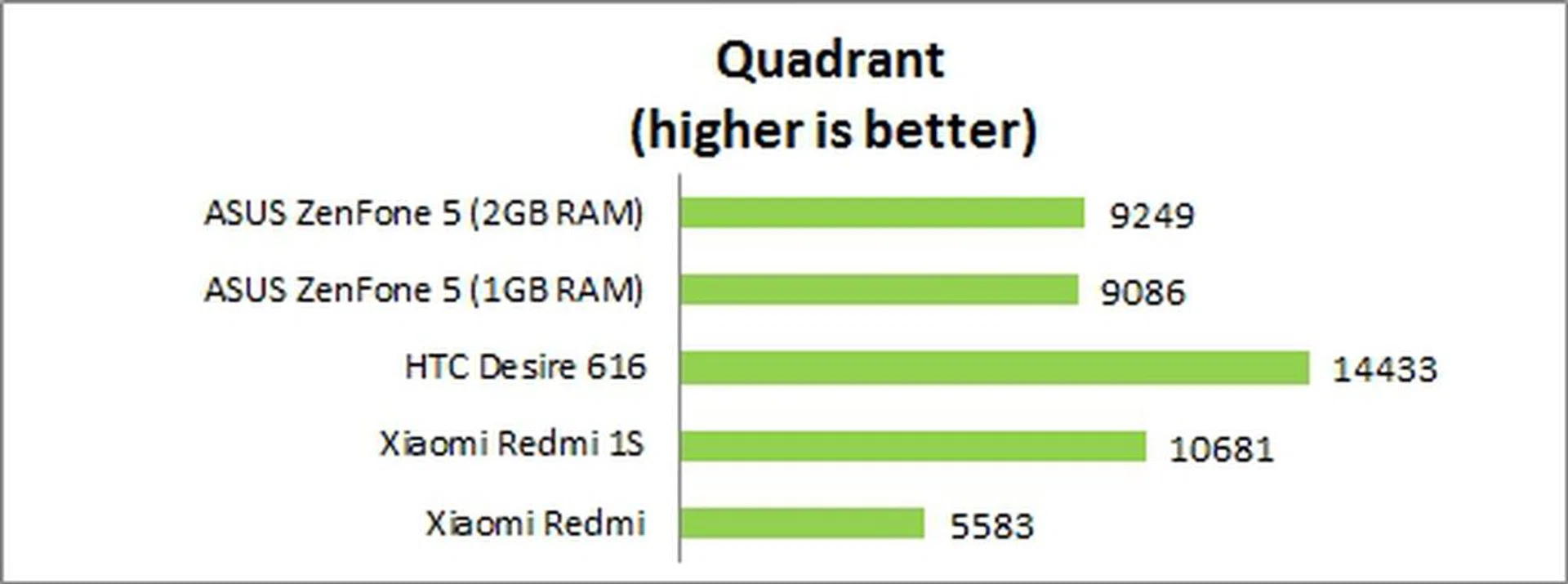 Three things to note here: Firstly, it is interesting to see the disparity in benchmark performance between the Redmi 1S and Redmi; the Snapdragon 400 processor's performance in the Quadrant benchmark is almost double that of its MediaTek counterpart. This probably explains the better general user experience over its predecessor. Also, while the Desire 616 outperformed the Redmi 1S in this test, during actual use, you'd have thought that the Redmi 1S is the faster device because you don't encounter as much micro-lags. Lastly, the retail ZenFone with 2GB RAM manages to inch past its 1GB self that was originally reviewed and this holds true in most of the tests.