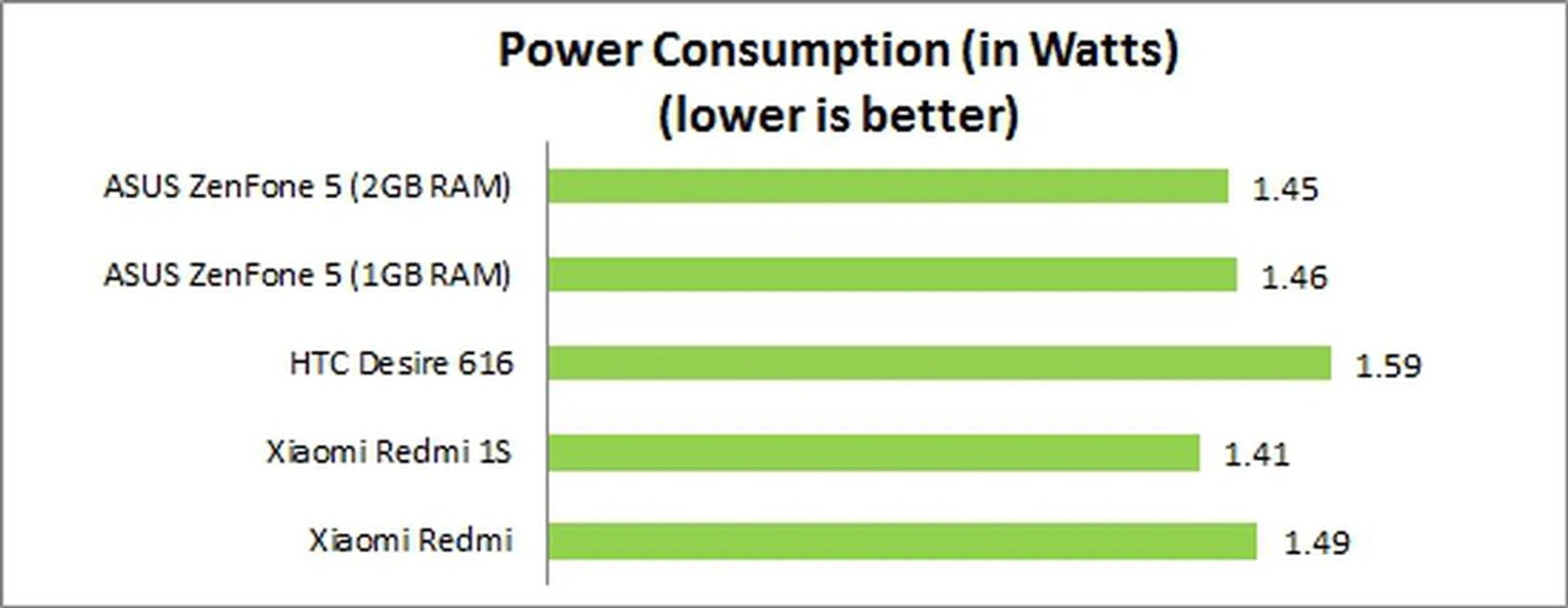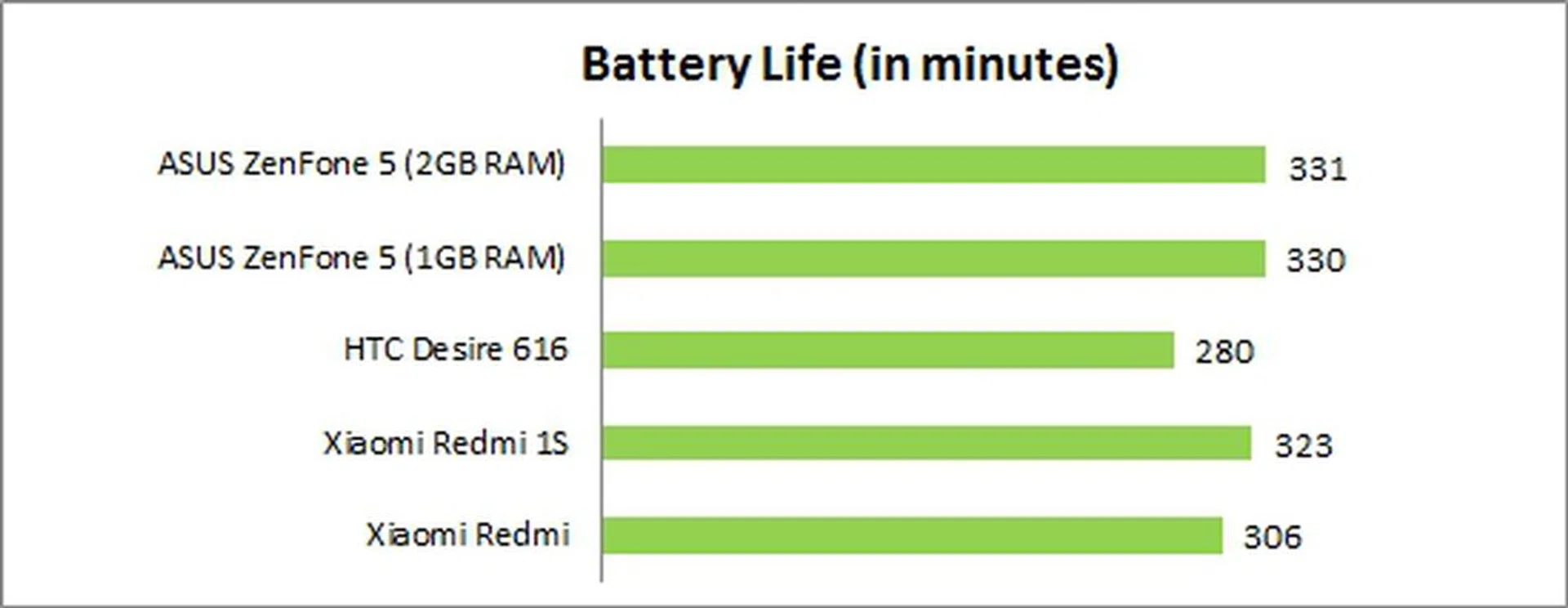 The ZenFone 5 and Redmi 1S are comparable in terms of battery mileage; the difference is merely 8 minutes. It's odd that the Desire 616 fell behind the pack by a significant margin; it lasted nearly an hour less than the ZenFone 5 even though both phones have 5-inch 720p displays, and that's despite it having a slightly higher battery capacity.