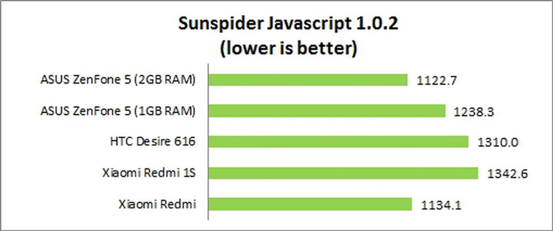The Intel Atom processor showed its strength in the SunSpider Javascript benchmark when the ZenFone 5 scored an overwhelming victory over the competition. In a twist of events, the original Redmi fared much better than the Redmi 1S. To give you a better idea where these three phones stand, the high-end phone like the LG G3, HTC One (M8) and Sone Xperia Z2 came in at under 1000ms.