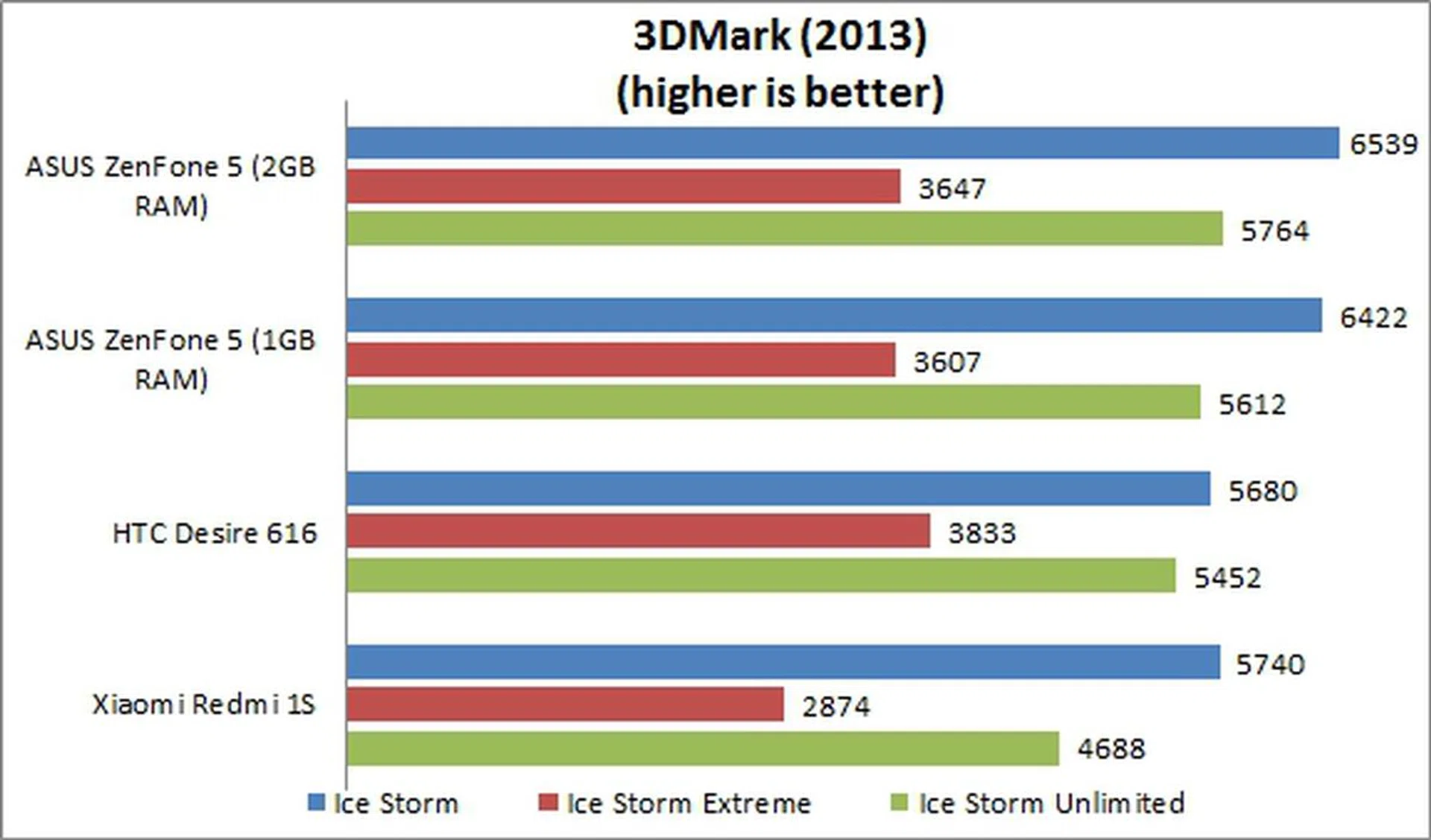 Due to its 8-core processor, the Desire 616 was able to maintain a healthy lead over the other two phones. It performed 56% and 35% better than the ZenFone 5 and Redmi 1S respectively. As a side note, the Desire 616 is on a par with the Huawei Honor 3X (with a score of 14,165), but just falls behind the Redmi Note (17,541).