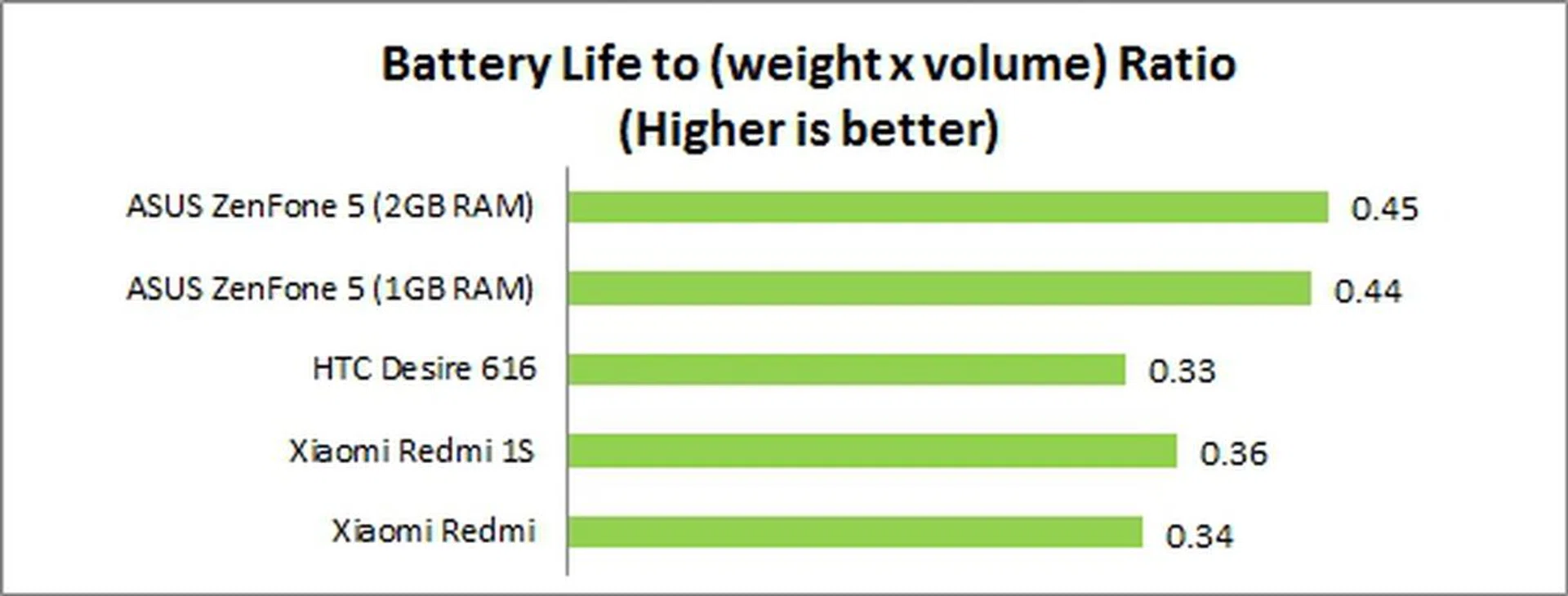 We measure the portability of a device by calculating its battery life to (weight x volume) ratio. As the ZenFone 5 is the lightest and boasts the longest battery mileage of the lot, the ASUS phone easily claimed the top spot in our Portability Index.