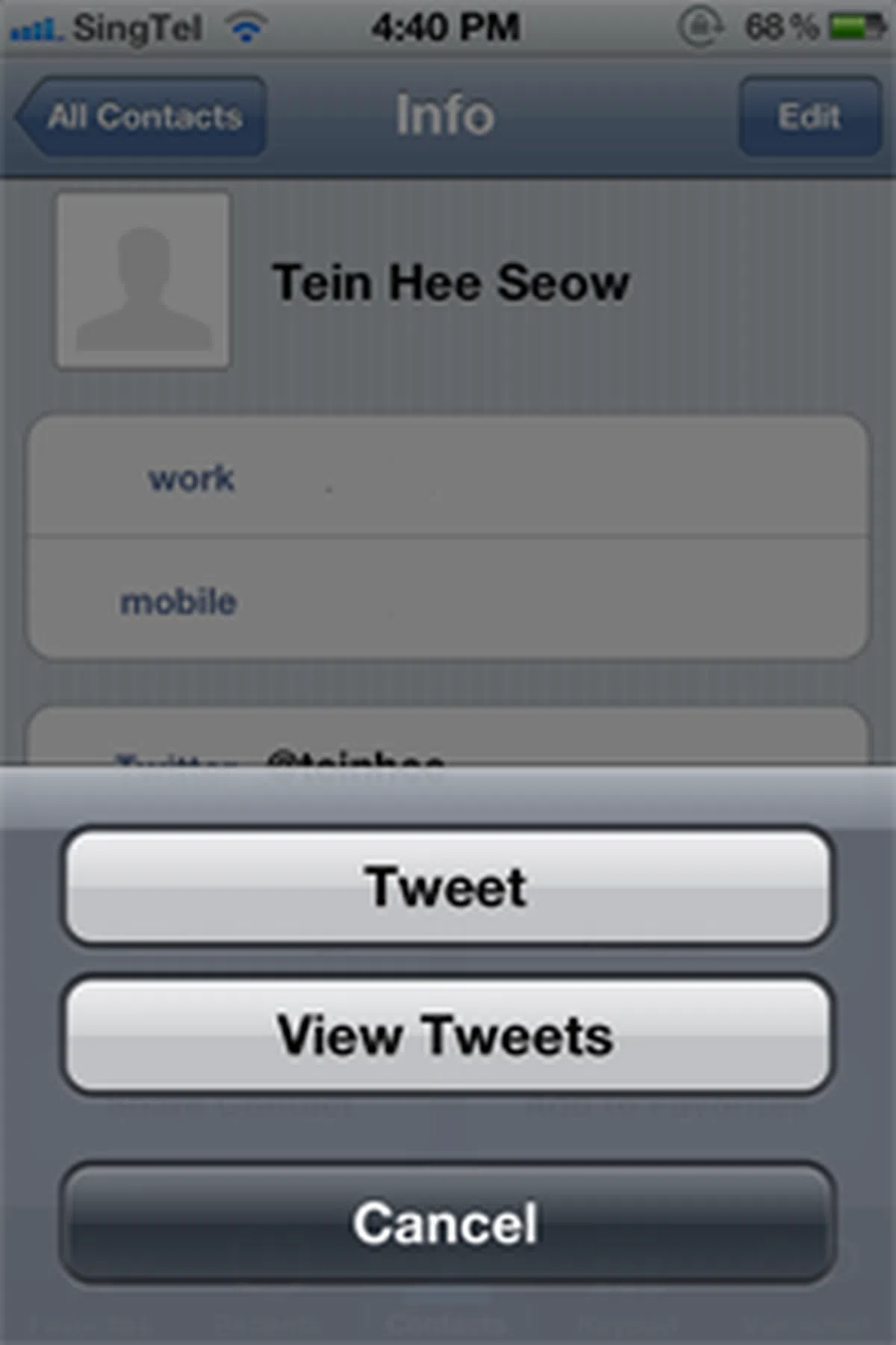 When it comes to images, videos, links and even location, you can now tweet straight from apps such as Camera, Maps and even Safari. And you can add more than one account. This is just one part of the Twitter integration that comes with iOS 5. Diving deeper, you can link Twitter accounts that matches the email addresses with your contact cards. And that means you can search for your fellow Twitter users and send them tweets via your contact cards. You are also given the option to view tweets, though this will bring you to the official Twitter app. And yes, that means you won’t be able to link the contact to other third party Twitter apps such as Tweetbot.