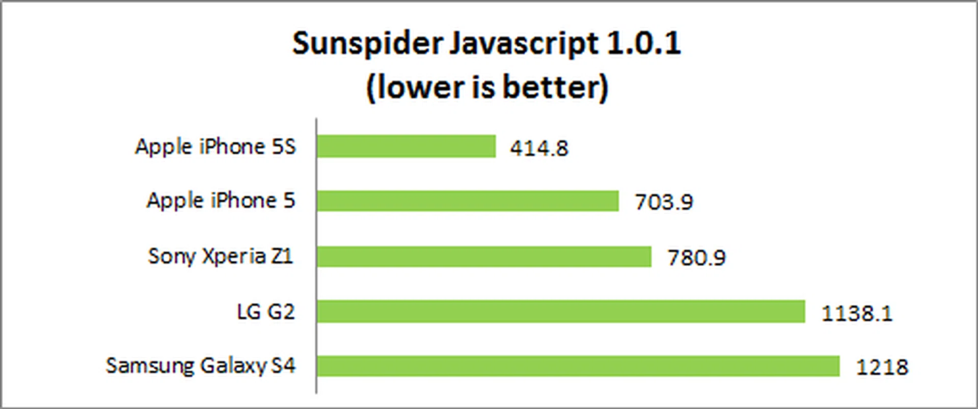 The 5S performed very well at this test, delivering a blistering fast speed of 414.8ms, making it nearly twice as fast as the iPhone 5 as well as the fastest Android smartphone, the Sony Xperia Z1.