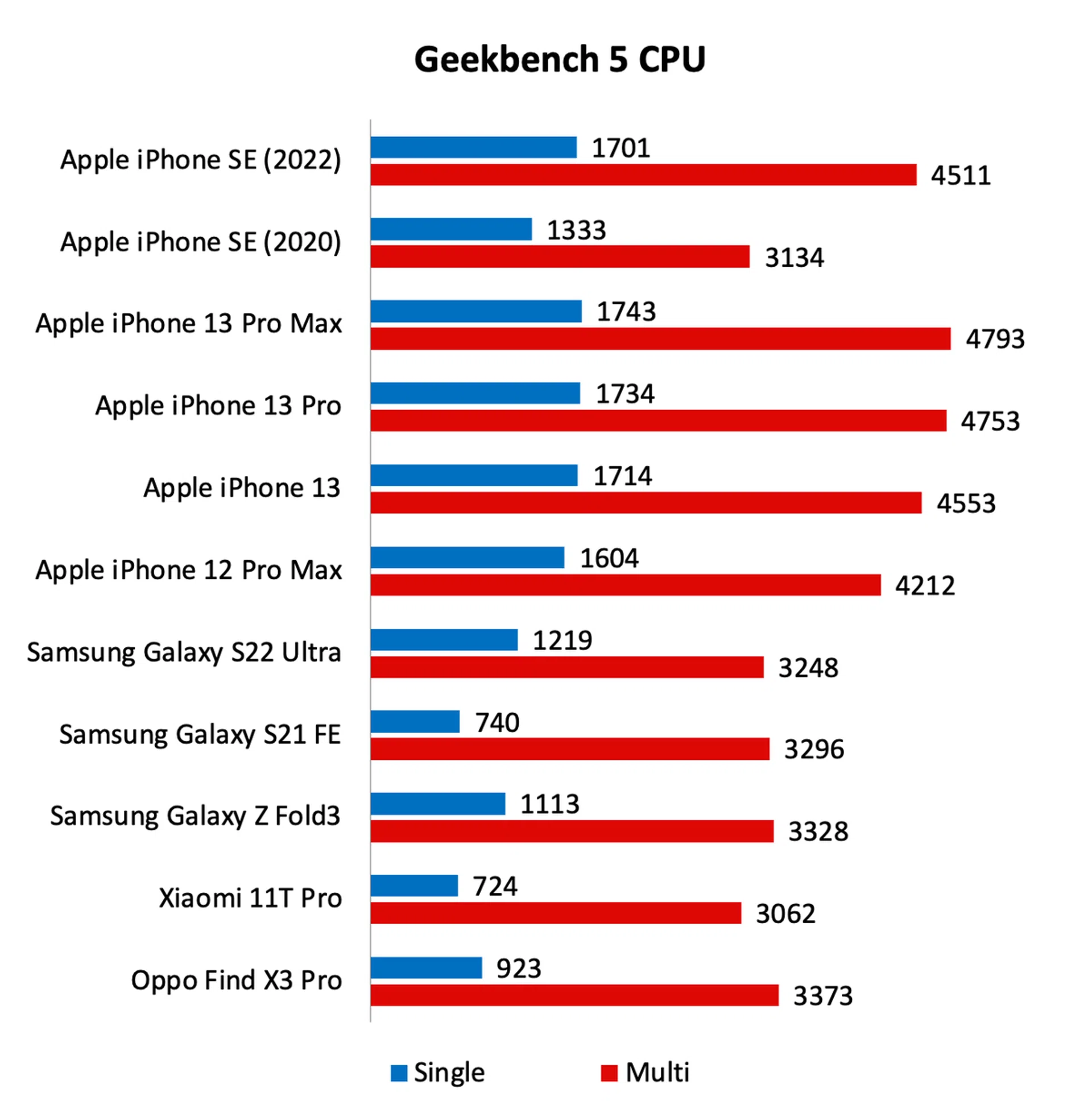 Because the iPhone SE is powered by the same chip found in the iPhone 13, their performance is more or less identical. The iPhone 13 Pro has better graphics performance because of its additional GPU core.