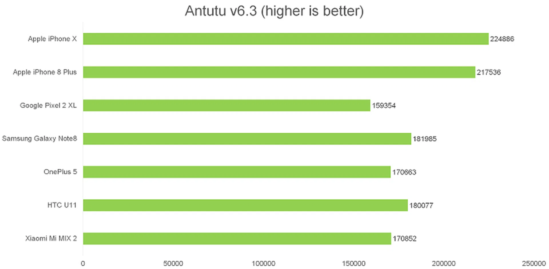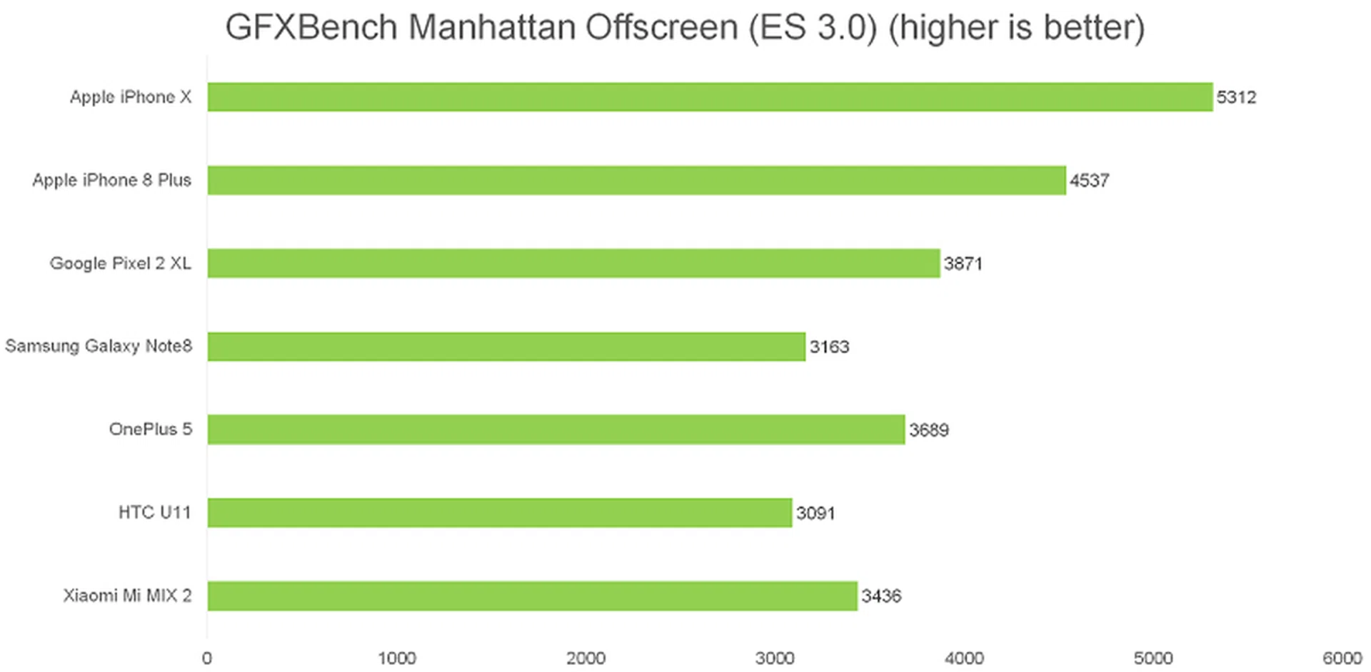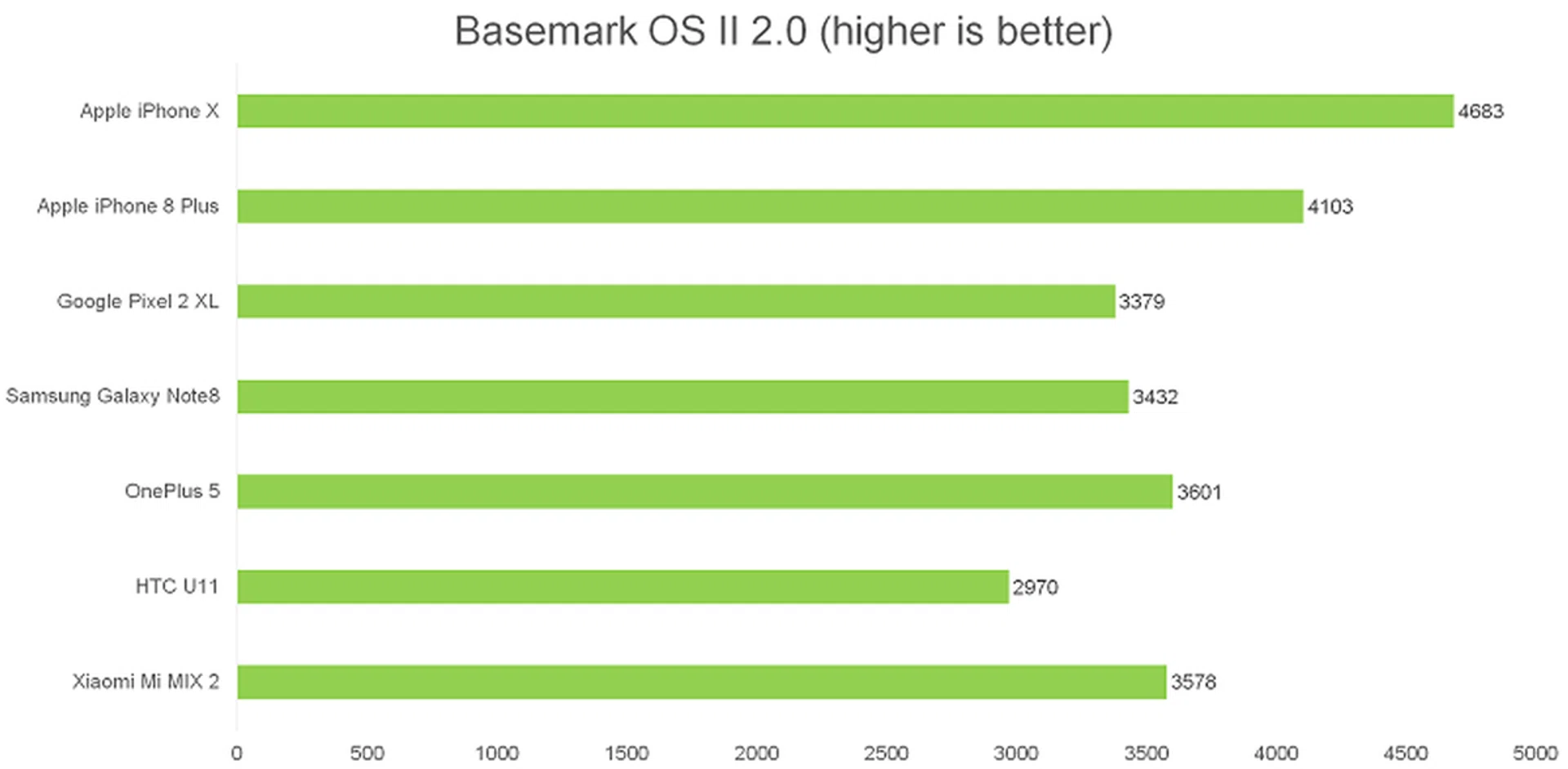 Surprisingly, the X scored a little higher than the 8 Plus, despite running on essentially identical specs. It's possible that the A11 was actually built with the X in mind, and is therefore slightly better optimized for it, or iOS 11.1 (which the X is running on) gives a slight performance boost over iOS 11 (which the 8 Plus is currently running on). When the iOS 11.1 update is available for the 8 Plus we'll re-test it to see if its score changes.