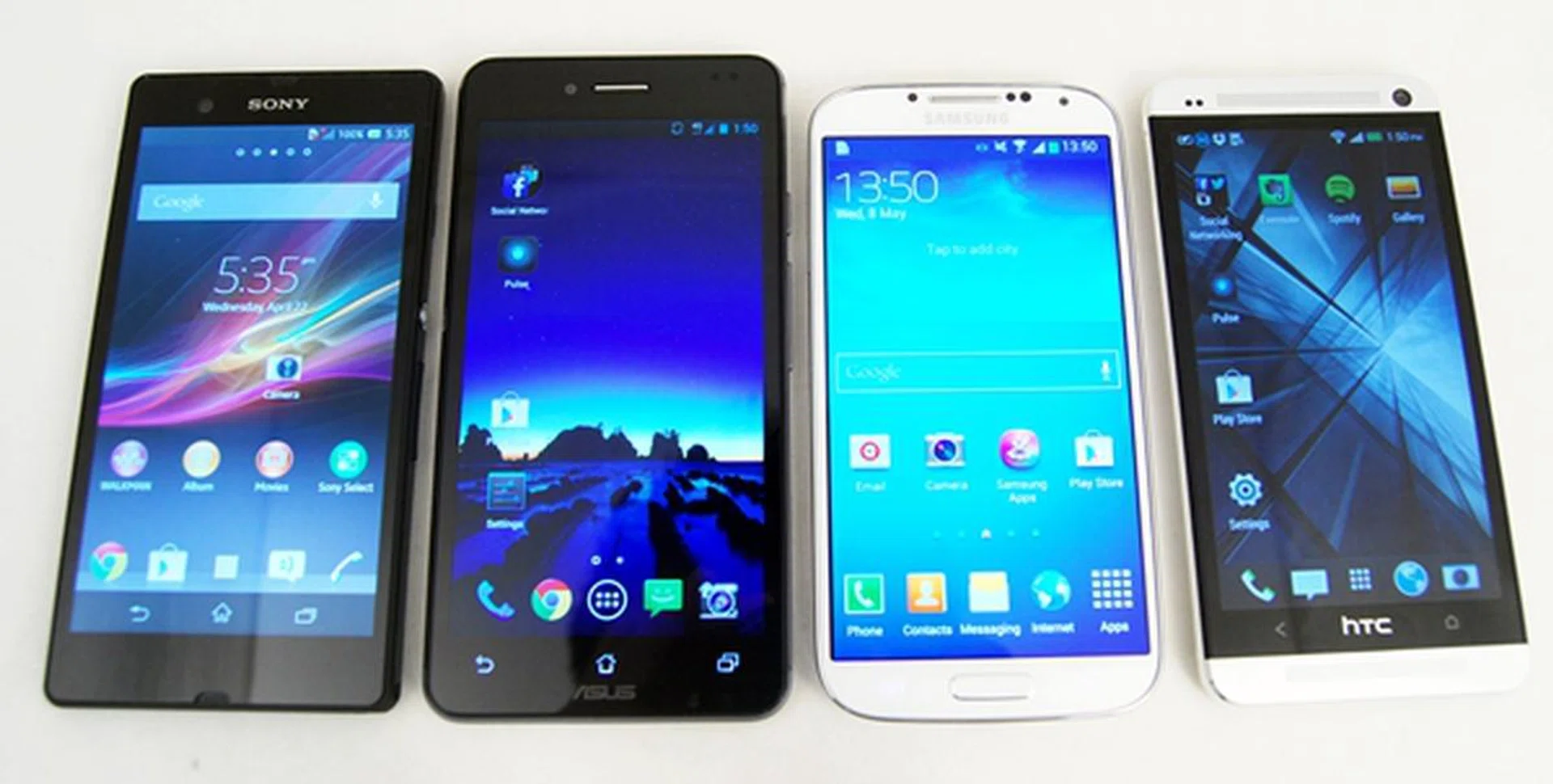 From left to right: Sony Xperia Z, ASUS PadFone Infinity, Samsung Galaxy S4 and the HTC One.