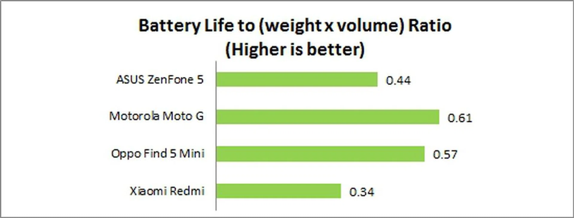 We measure the portability of a device by calculating its battery life to (weight x volume) ratio. Since it is the only 5-inch phone in this comparison, the ZenFone 5 obviously has a bigger footprint than the other phones.