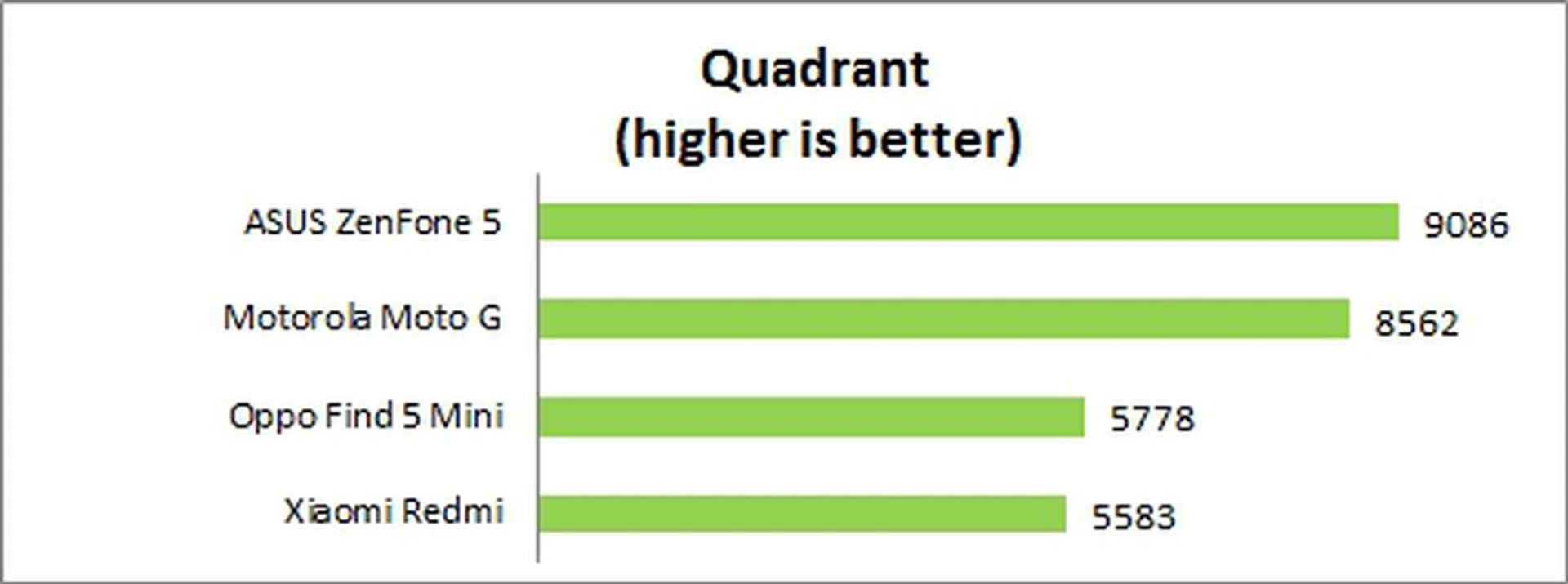 Quadrant evaluates a device's CPU, memory, I/O and 3D graphics performances. The ZenFone 5 tops the Quadrant benchmark with a score of 9,086 which shows a 63% better performance over the Xiaomi Redmi. The Moto G, with its stock Android interface, surprisingly could not keep up with the ZenFone 5.