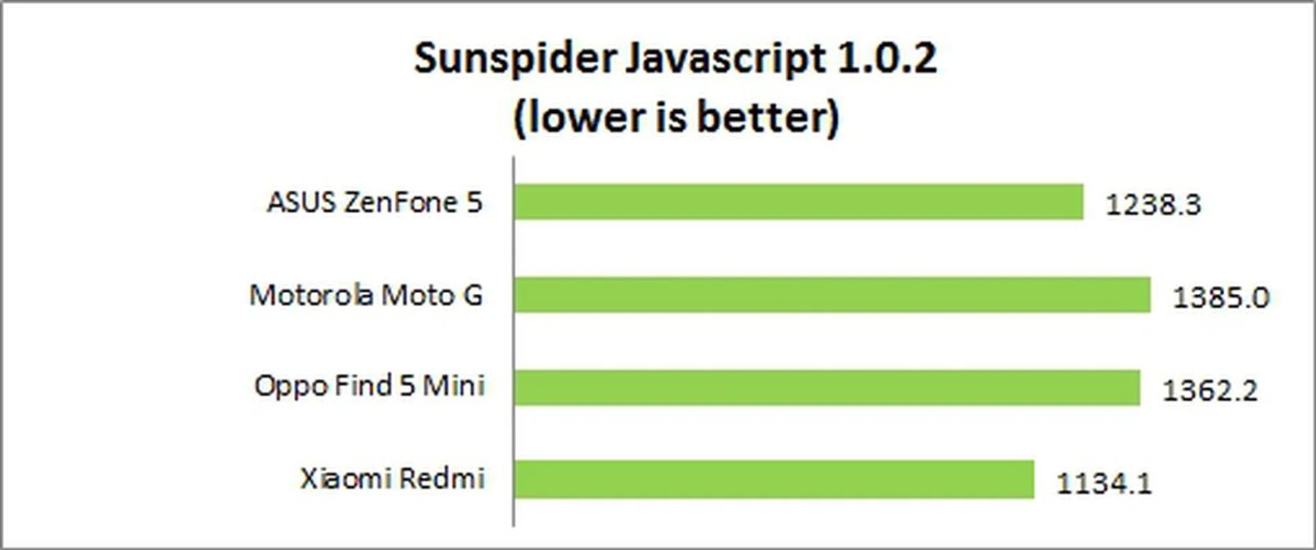 SunSpider JavaScript helps measure the browsing performance of a device when processing JavaScript. It not only takes into consideration the underlying hardware performance, but also assesses how optimized a particular platform is at delivering a high-speed web browsing experience. The ZenFone 5 ranked second in this benchmark behind the Redmi.