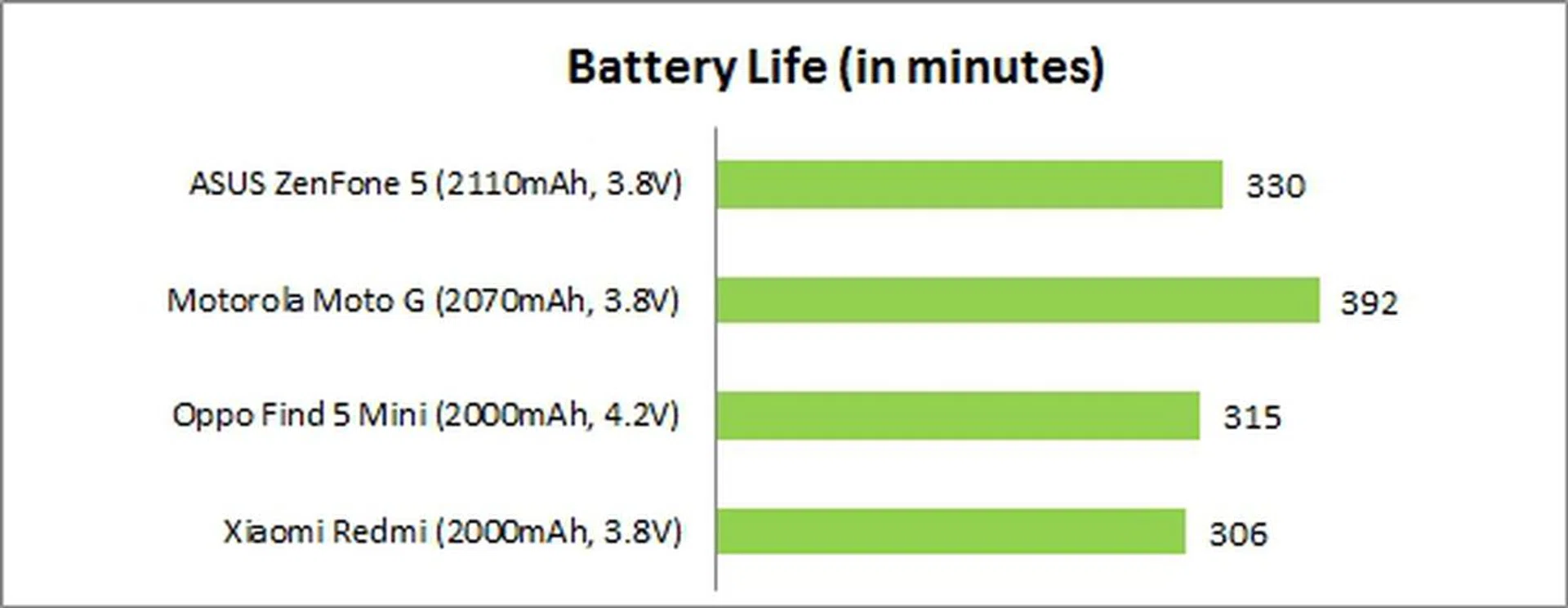 Even though the ZenFone 5 has the biggest battery capacity among the four phones compared, it did not last the longest. In our video looping test, the ZenFone 5 lasted an hour short of the Moto G even though both phones have 720p displays. Its lower-than-expected battery mileage could be attributed to the slightly bigger display and the more power-hungry ZenUI, which have features like What's Next and Do It Later running in the background to keep things up-to-date.