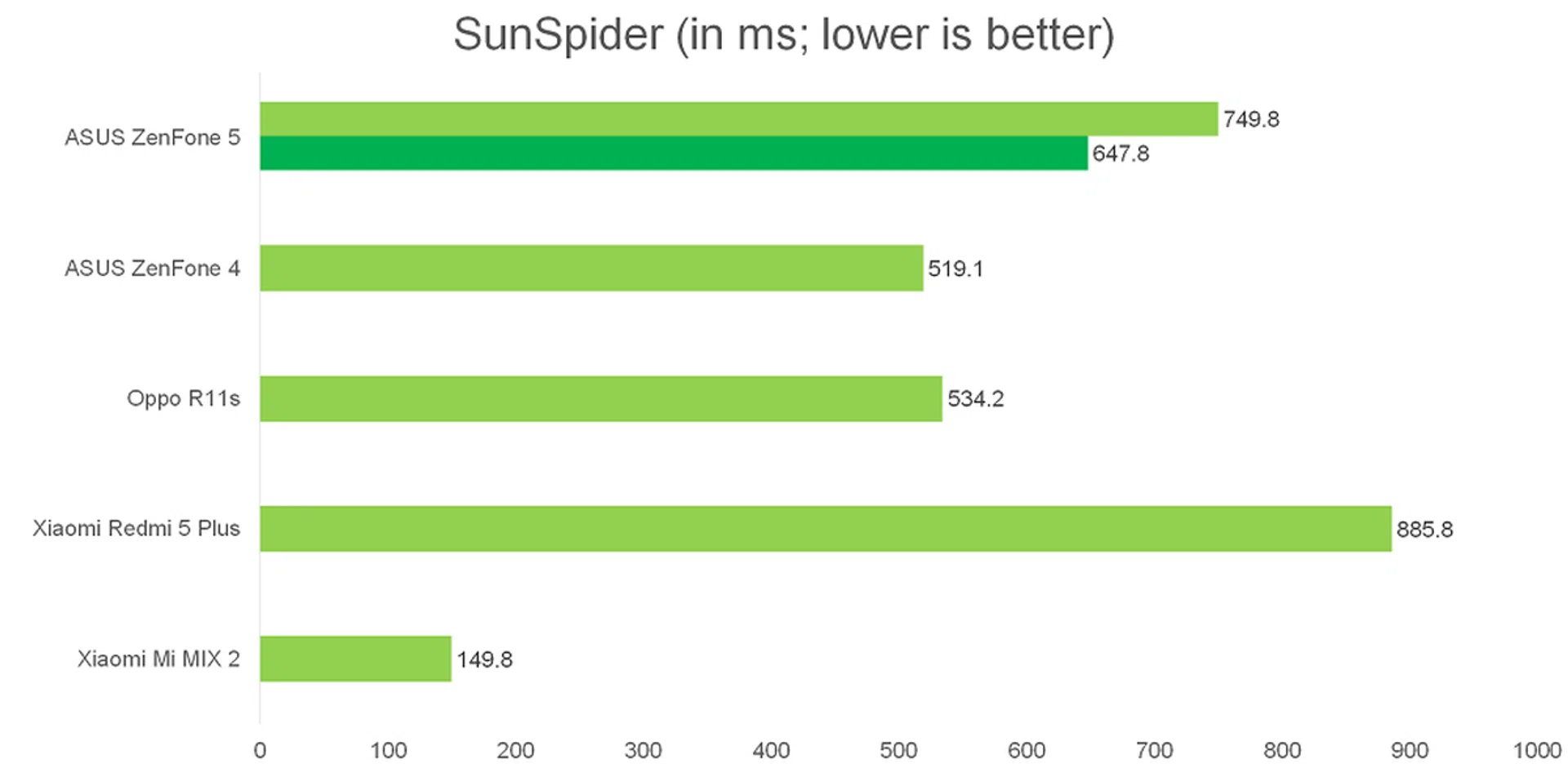 The ZenFone 5's 636 processor fared about as well as expected, scoring in between the 660-powered ZenFone 4 and the 625-powered Xiaomi Redmi 5 Plus. Surprisingly, AI Boost actually lowered the ZenFone 5's score here quite a bit. This test is run in Chrome, so I didn't expect it to make much of a difference, but it was over 100ms faster.