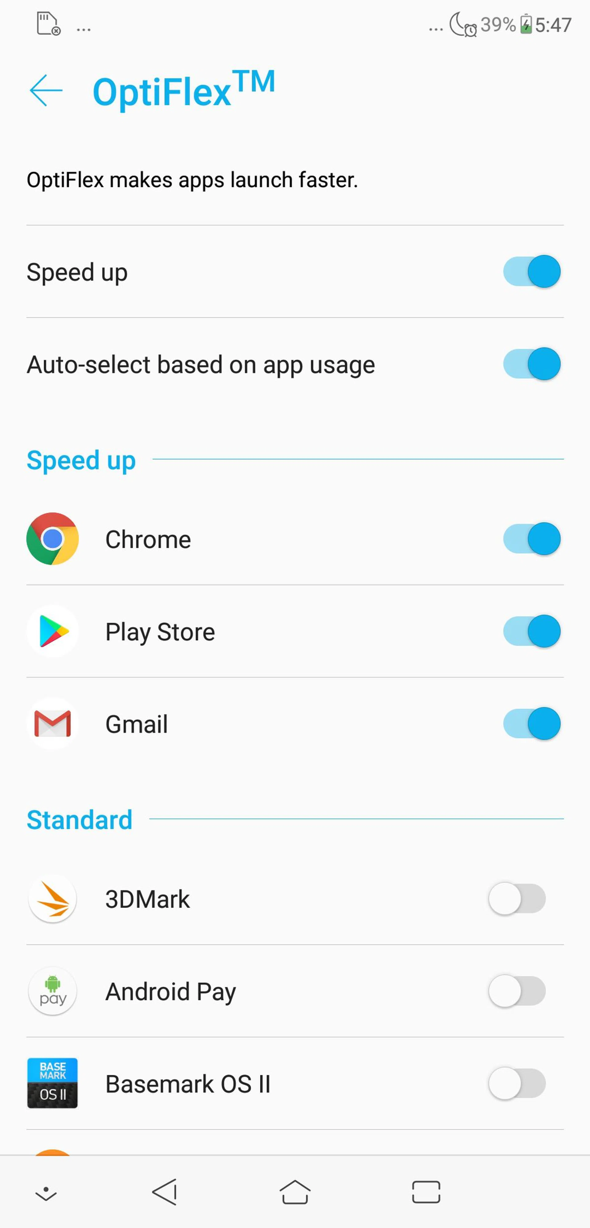 There's also a Twin Apps option, which we've seen on a number of other Android phones, which lets you create a second version of an app so you can manage two accounts at the same time. There's also something called OptiFlex, which apparently speeds up the startup of selected apps, although I didn't really notice it doing anything.