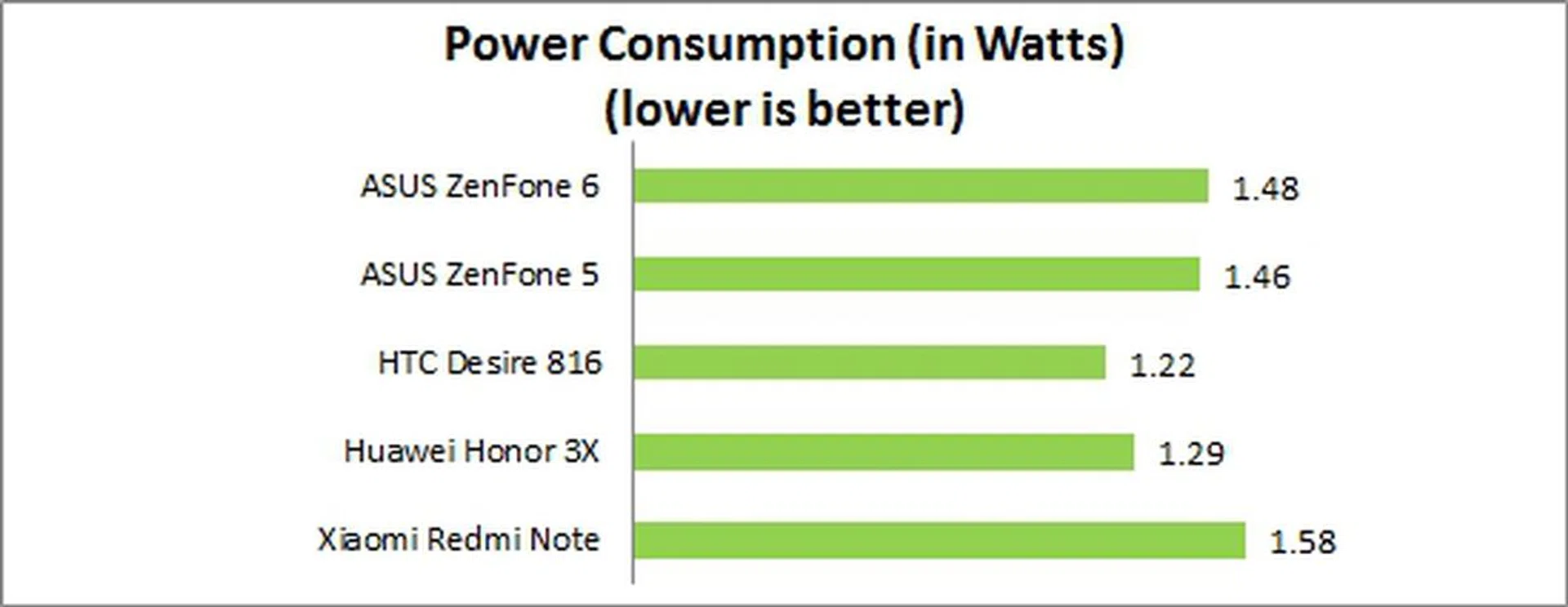 Its power consumption is also relatively high compared to the Desire 816 and Honor 3X; the ZenFone 6 drew about 20% more power. Nonetheless, ASUS managed to keep the power consumption on the ZenFone 6 below that of the Redmi Note and is in fact just about the same levels as the ZenFone 5. Considering that the ASUS ZenFone 6 is the only 6-inch device compared here, its results are commendable.