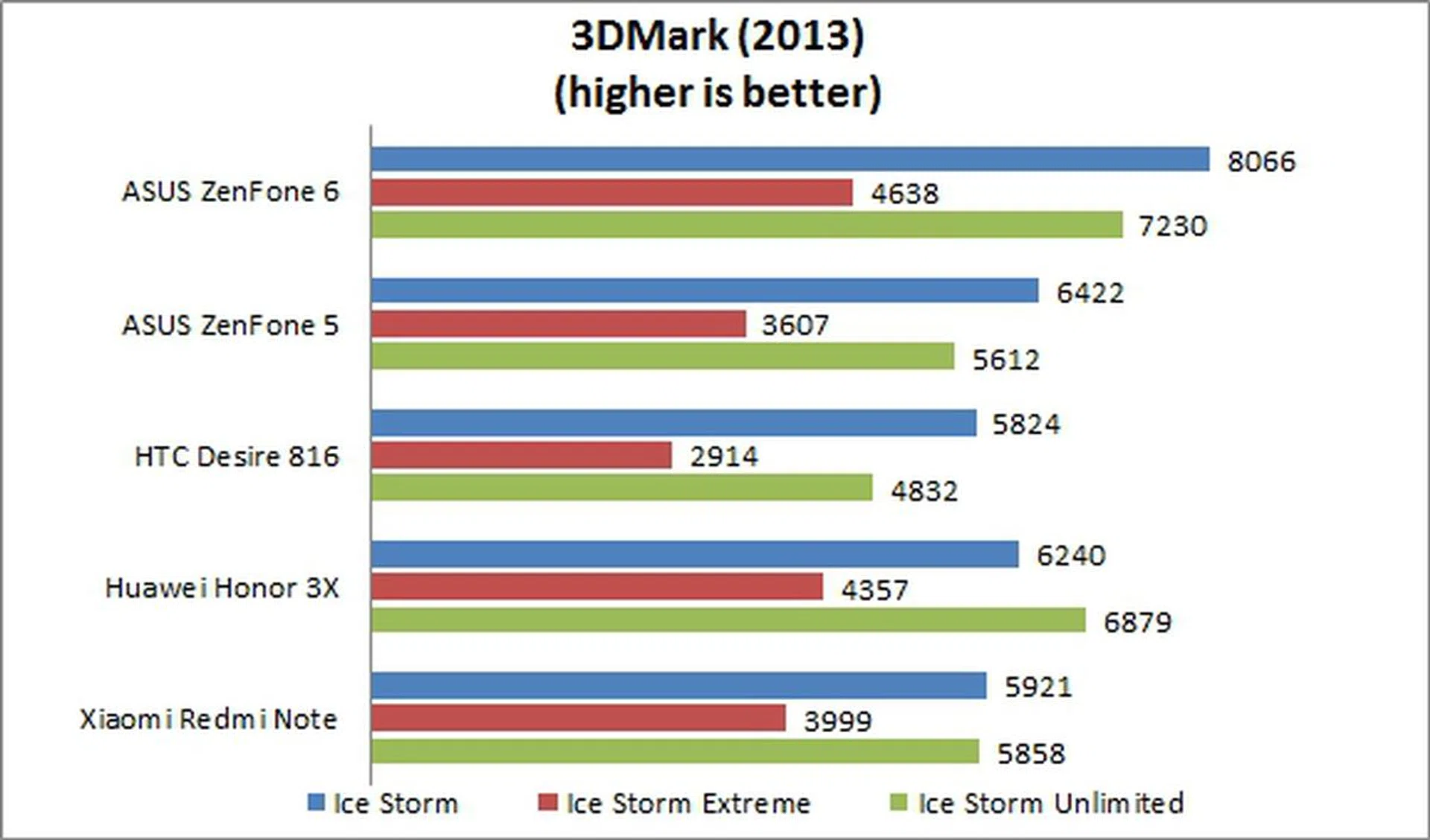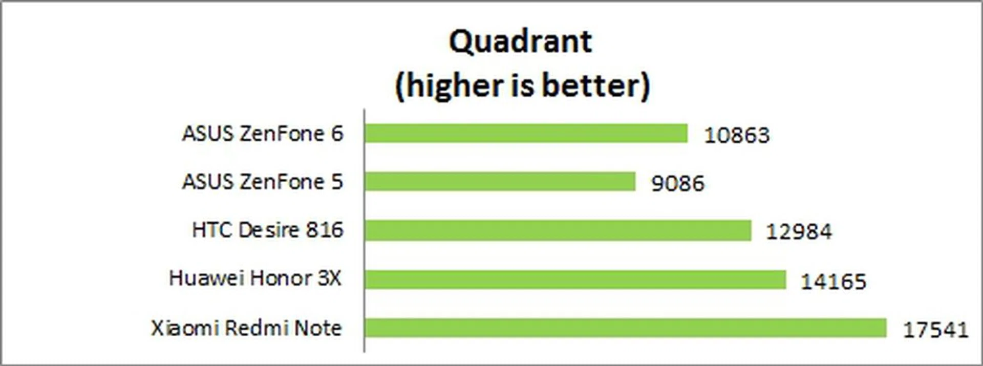 Due to its slightly higher clock speed for its CPU and GPU, the ZenFone 6 is able to perform 20% better than the ZenFone 5. However, both Intel Atom dual-core processors are no match for the quad-core (Desire 816) and octa-core processors in the Honor 3X and Redmi Note.For example, the Redmi Note trashed the ZenFone 6 in the Quadrant benchmark by about 61%. However synthetic benchmarks like these don't tell the whole story. Read on and you might be surprised.