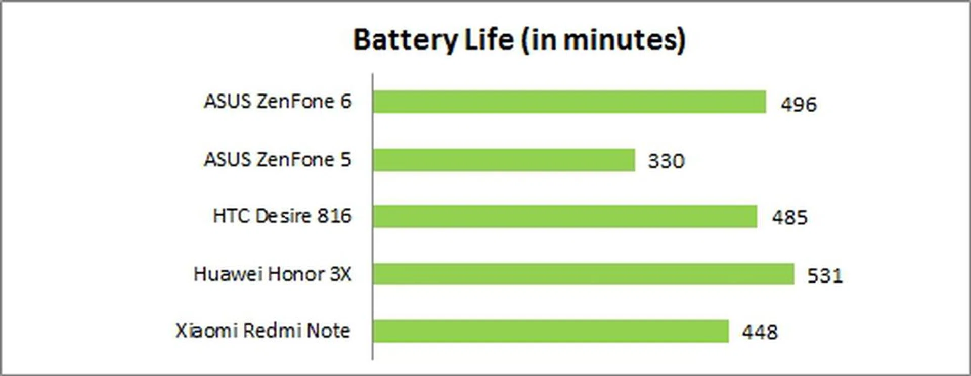 For a 6-inch device to last as long or even slightly longer than some of its 5.5-inch counterparts is an impressive feat. The ZenFone 6 lasted more than 8 hours in our standard battery test, which is about 10 minutes longer than the Desire 816. In fact, the ZenFone 6 managed to last 48 minutes longer than the Redmi Note! In the context of the ZenFone 5, the larger ZenFone lasted 50% longer.