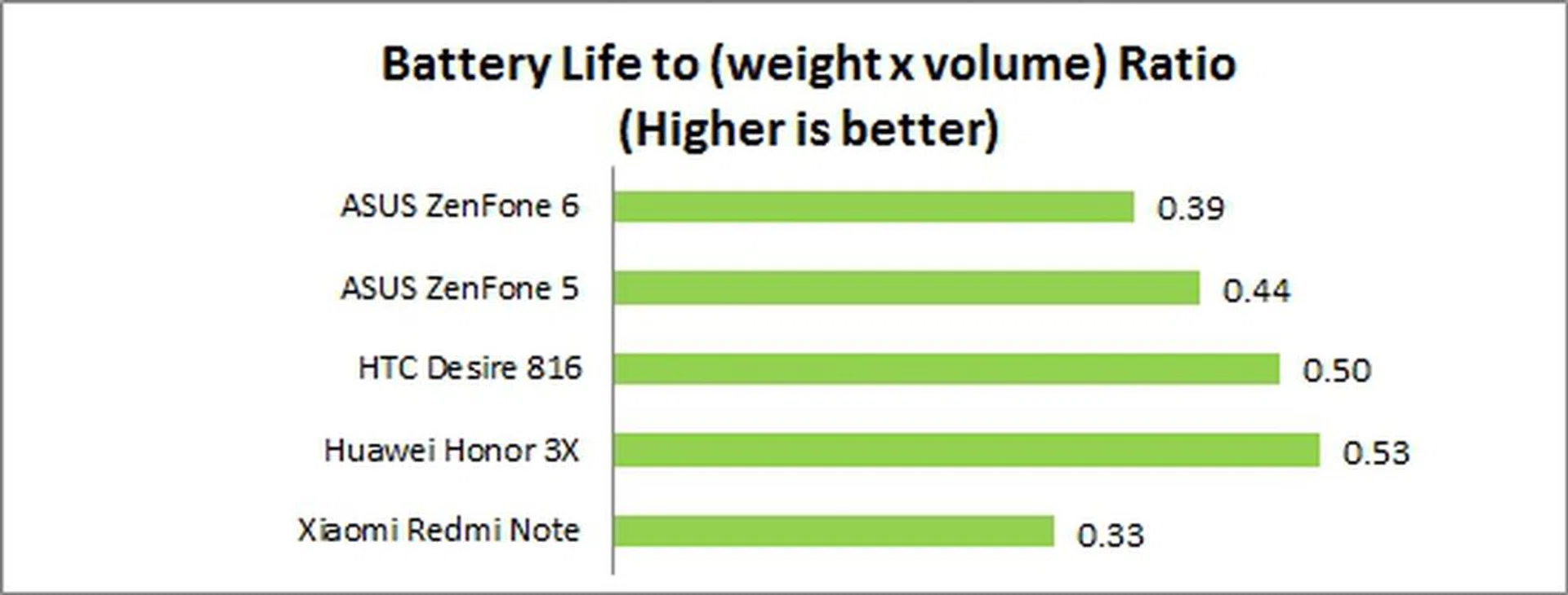 We measure the portability of a device by calculating its battery life to (weight x volume) ratio. Since it is the only 6-inch phone in this comparison, the ZenFone 6 obviously has a bigger footprint than the other phones and did not fare as well despite its better battery life. For those curious, the 6.1-inch Huawei Ascend Mate managed just 0.31 in this index, while the Sony Xperia Z Ultra only clinched an index of 0.22. Comparatively, the ZenFone 6 is far better. And as reported in the graph here, you just have to look at the 'smaller' Xiaomi Redmi Note's standing to appreciate that the ZenFonce 6 offers a pretty good portability index.