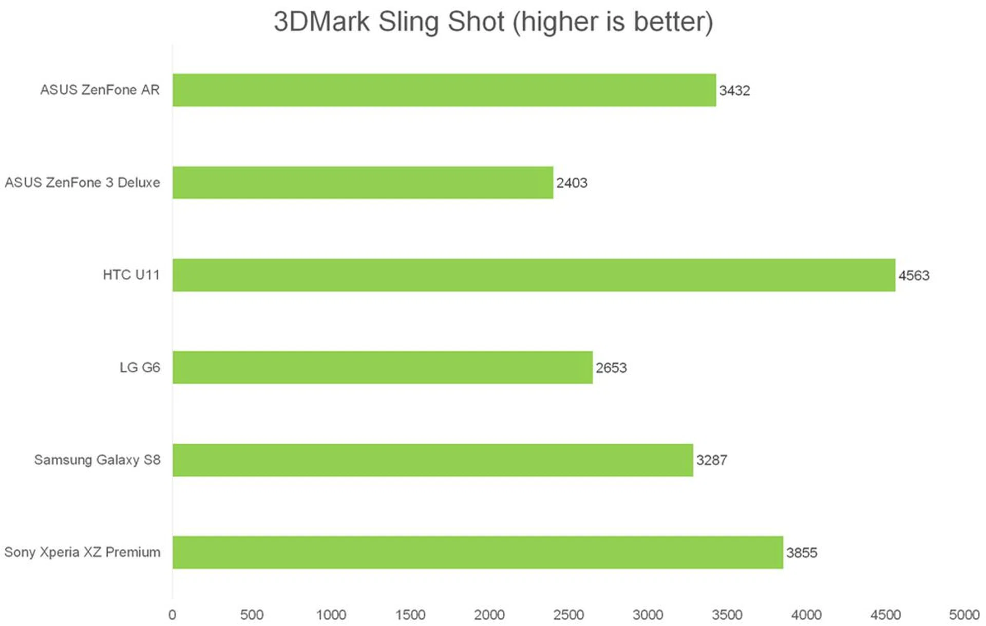 3DMark Sling Shot is an advanced 3D graphics benchmark that tests the full range of OpenGL ES 3.1 and ES 3.0 API features including multiple render targets, instanced rendering, uniform buffers and transform feedback. The test also includes impressive volumetric lighting and post-processing effects. We're running this benchmark in Unlimited mode, which ignores screen resolutions. The ZenFone AR performed better than we expected, as it’s ahead of the LG G6 (which is also equipped with the Snapdragon 821 chipset).