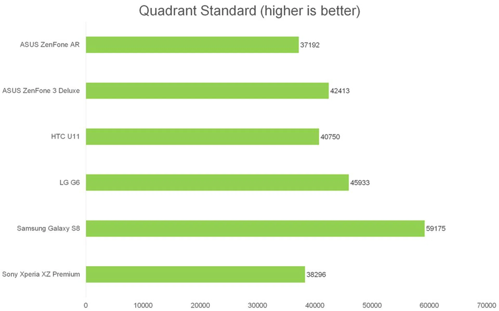 Quadrant is an Android benchmark that evaluates a device's CPU, memory, I/O and 3D graphics performance. Take this benchmark with a grain of salt, because both the U11 and XZ Premium massively underperformed here. Also, the ZenFone AR underperformed when compared to the less powerful ZenFone 3 Deluxe, when it’s supposed to report numbers that are closer to the LG G6 instead.