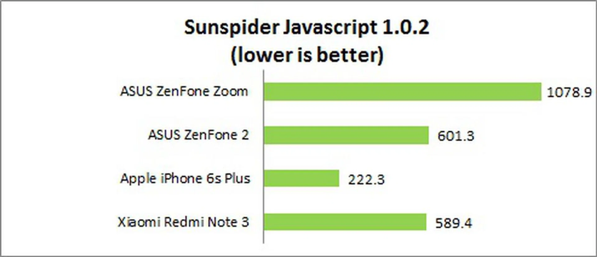 SunSpider JavaScript helps measure the browsing performance of a device when processing Javascript. It not only takes into consideration the underlying hardware performance, but also assesses how optimized a particular platform is at delivering a high-speed web browsing experience. The SunSpider benchmark further convinced us that software optimization may be at fault for the sub-par benchmark performance of the ZenFone Zoom.