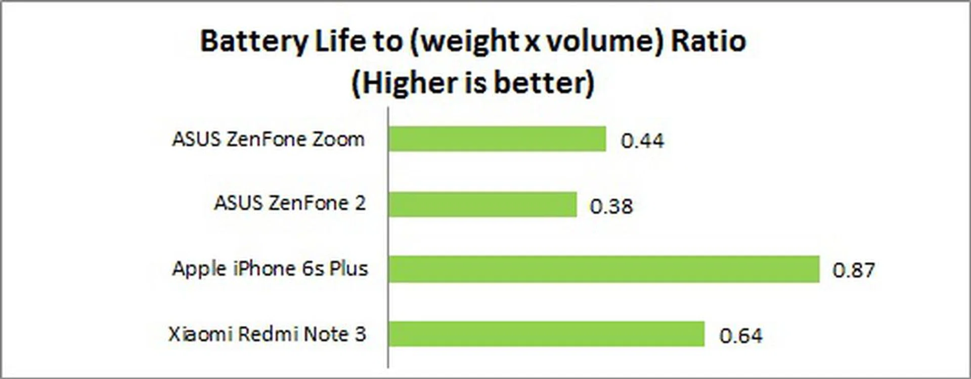 We measure the portability of a device by calculating its battery life to (weight x volume) ratio. As the ZenFone Zoom is the second heaviest and has one of the biggest footprints, it did not fare well in the Portability Index.