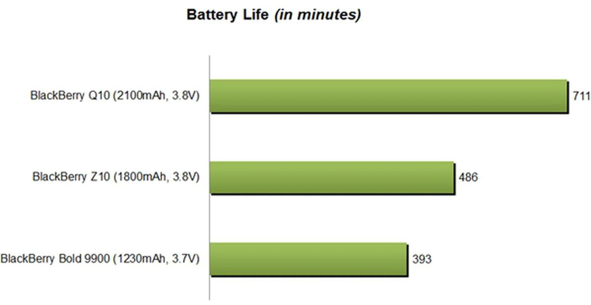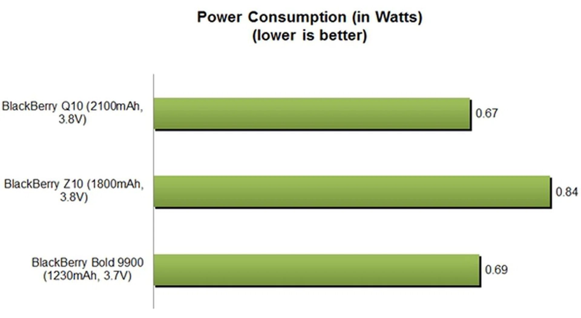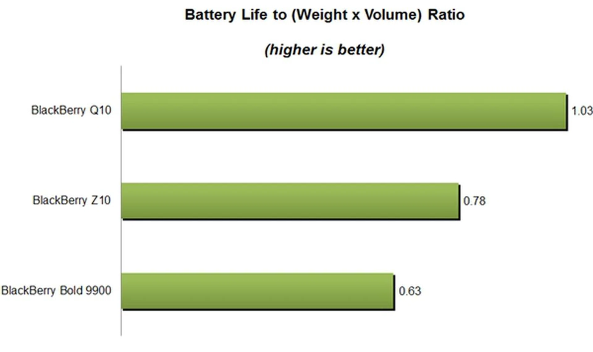 Battery performance has never been an issue for BlackBerry flagship devices and the Q10 is no different. It clocked an impressive mileage of nearly 12 hours. However, it's also not surprising why it's able to sustain such a long battery up-time - the Q10 has the biggest battery capacity among all the BlackBerry smartphones, and the small power-efficient Super AMOLED display also helps its cause. Based on the Power Consumption chart, this is indeed true as the Q10 registered a lower 0.67W power draw compared to the Z10 (0.84W) and Bold 9900 (0.69W). Therefore, it is not surprising that the Q10 tops the Portability Index where each device is assessed on its ability to balance battery mileage with its size and weight. For more comparisons with other mid-sized phones, check out the performance page in our BlackBerry Z10 review.