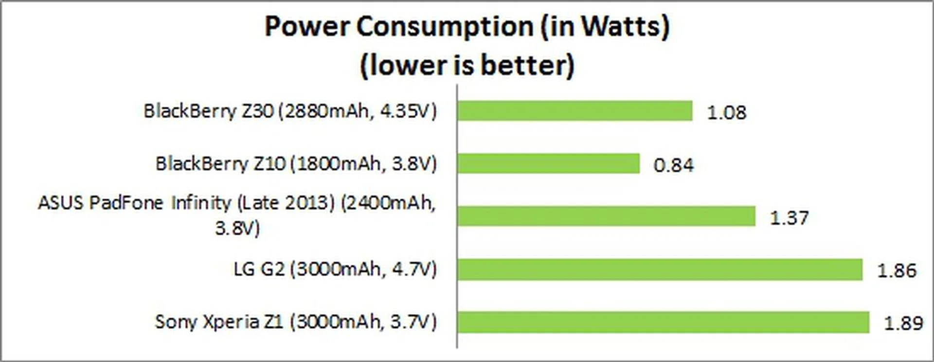 Looking at the Power Consumption chart, the Z30 has one of the lowest power consumption at 1.08Wh and the chart also shows why the G2 and Z1 failed to hit the record set by the Z30. Its lower power consumption can be attributed to the fact that the Z30 uses a more power-efficient AMOLED display and requires powering lesser pixels on its display compared to the 1080p screens on the PadFone Infinity (Late 2013), G2 and Z1.
