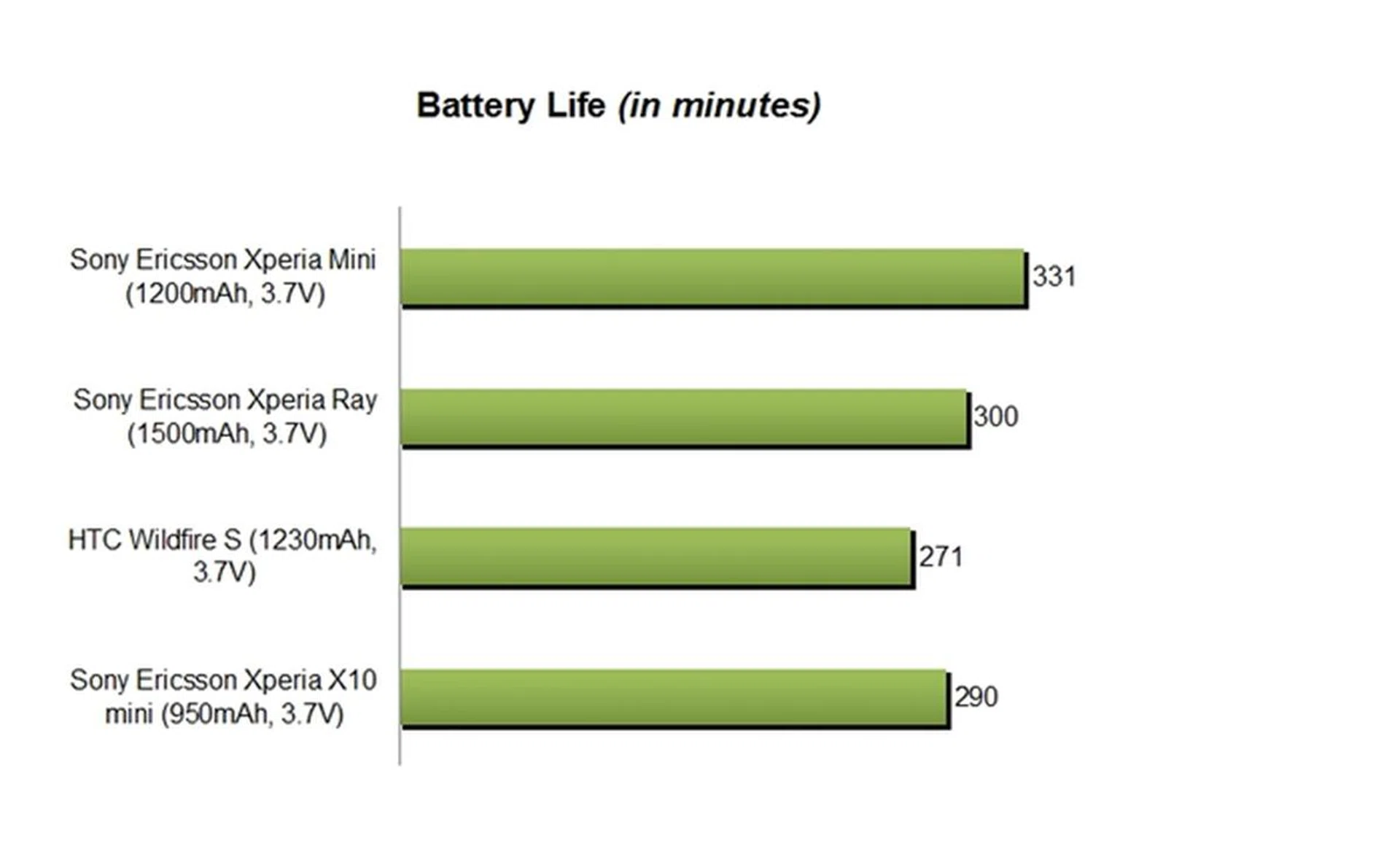 It is also important to note is that the Mini outlasted its predecessor by 40 minutes. With that said, this is mostly due to a higher 1,200mAh battery capacity (the Xperia X10 mini comes with a 950mAh battery). Unsurprisingly, both the HTC Wildfire S and Xperia Ray tailed behind mostly due to their bigger touchscreens.