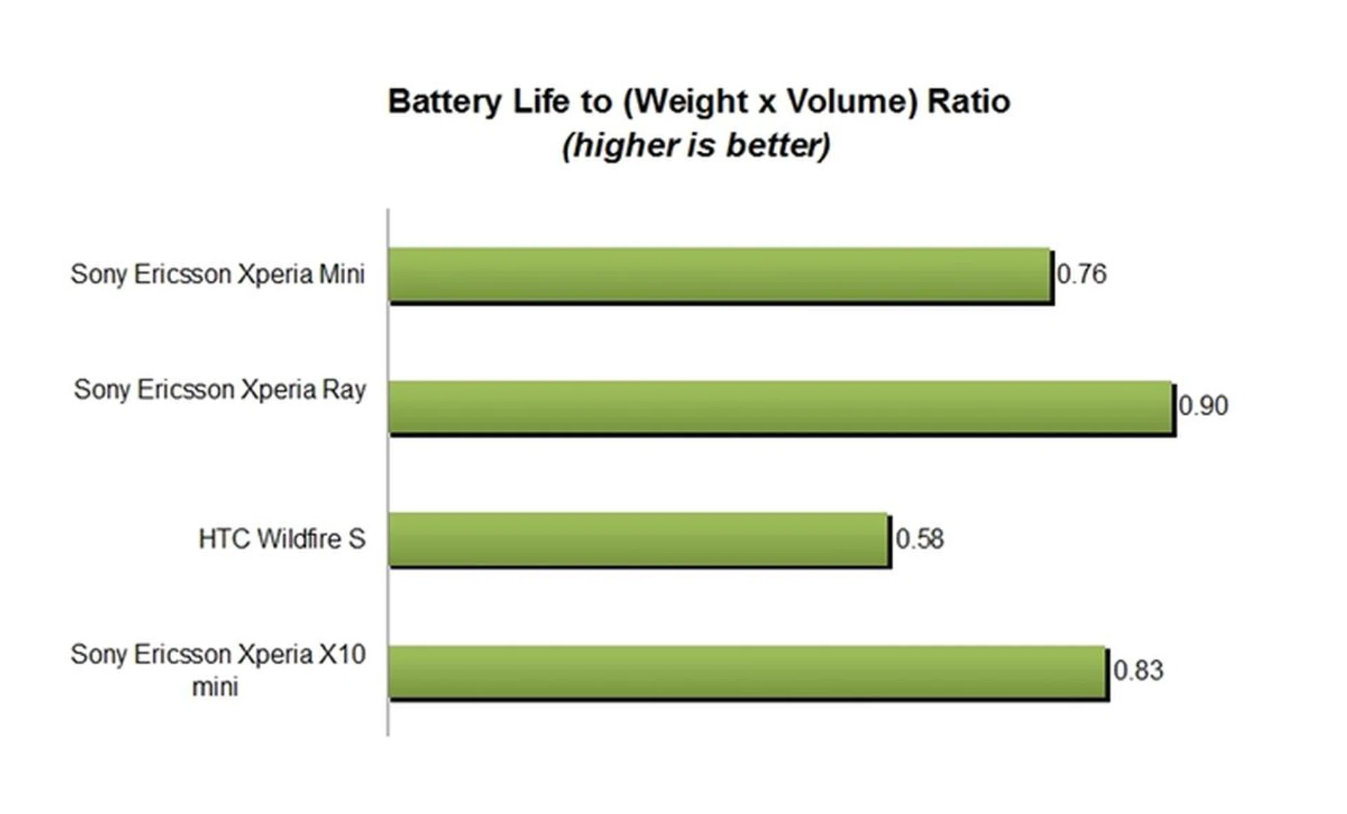 For the outcome in the portability ratio metrics, the higher battery life, coupled with a lower weight and volume, gave it a decent standing. Still, it's somewhat hampered by a small but bulky body. As such, the impossibly slim Xperia Ray and smaller X10 Mini scored better compared to the Mini.