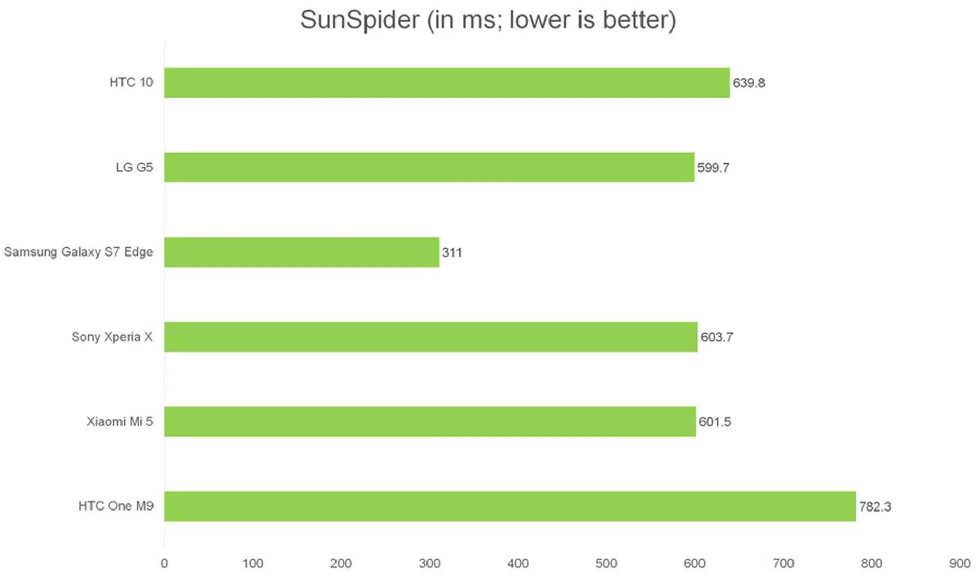 SunSpider JavaScript measures the browsing performance of a device when processing JavaScript. It not only takes into consideration the underlying hardware performance, but also assesses how optimized a particular platform is at delivering a high-speed web browsing experience. While the HTC 10 didn't outrun its peers in this benchmark, we actually found its real-world browser performance to measure up nicely against its rivals.