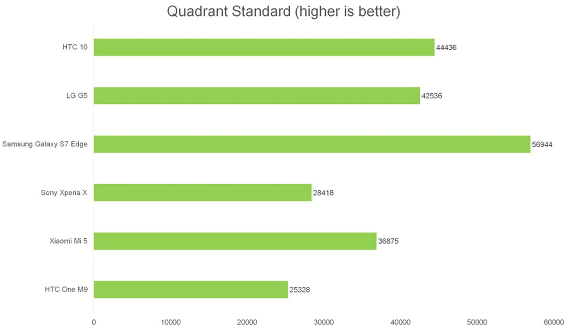 Quadrant benchmarks a device’s CPU, I/O, and GPU performance. The HTC 10 has a strong performance in this benchmark, just falling short of the Exynos-powered S7 Edge.