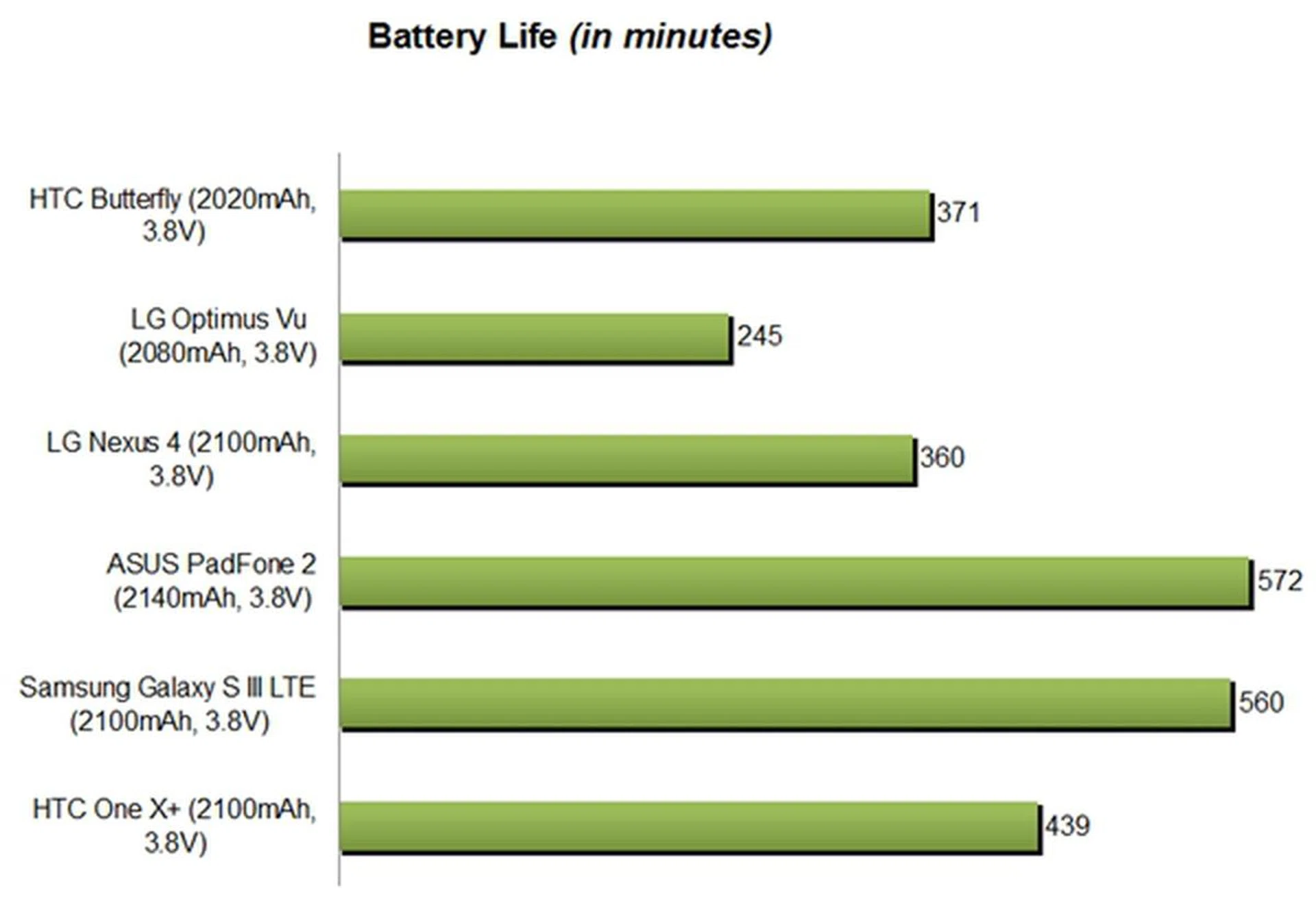 As you can see, the Butterfly did not fare too badly by clocking a decent battery uptime of 6 hours and 11 minutes. Although it is a far cry from the ASUS PadFone 2, one has to take into account the smaller screen and slightly bigger battery capacity of the PadFone 2. Moreover, the HTC Butterfly actually fared better than its 5-inch counterpart, the LG Optimus Vu.