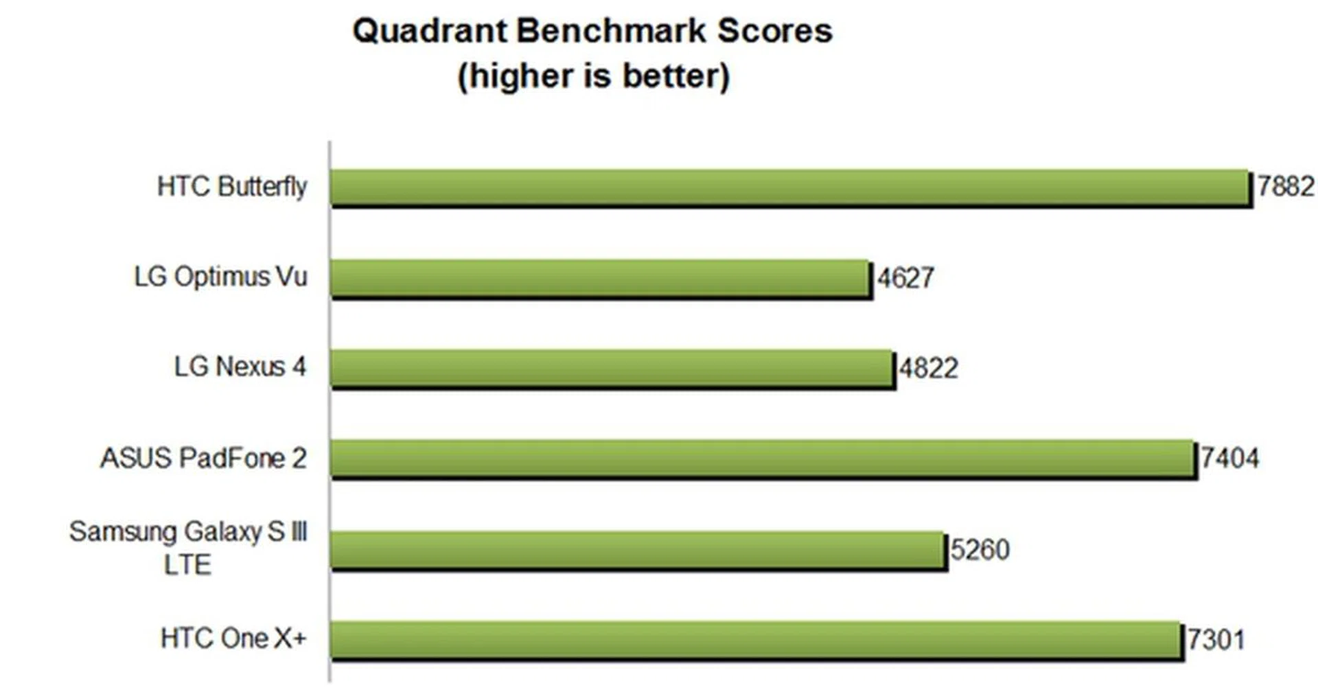 Riding on the momentum built up by the One X+, the Butterfly scored another victory over the competition in the Quadrant benchmark. The NVIDIA Tegra 3 quad-core 1.5GHz processor in the LG Optimus Vu simply could not match up to the Qualcomm Snapdragon S4 Pro processor, as seen in the chart toppling scores of the ASUS PadFone 2, HTC One X+ and the HTC Butterfly. The LG Nexus 4 is an exception as Android 4.2 may not be optimized for the Quadrant benchmark.