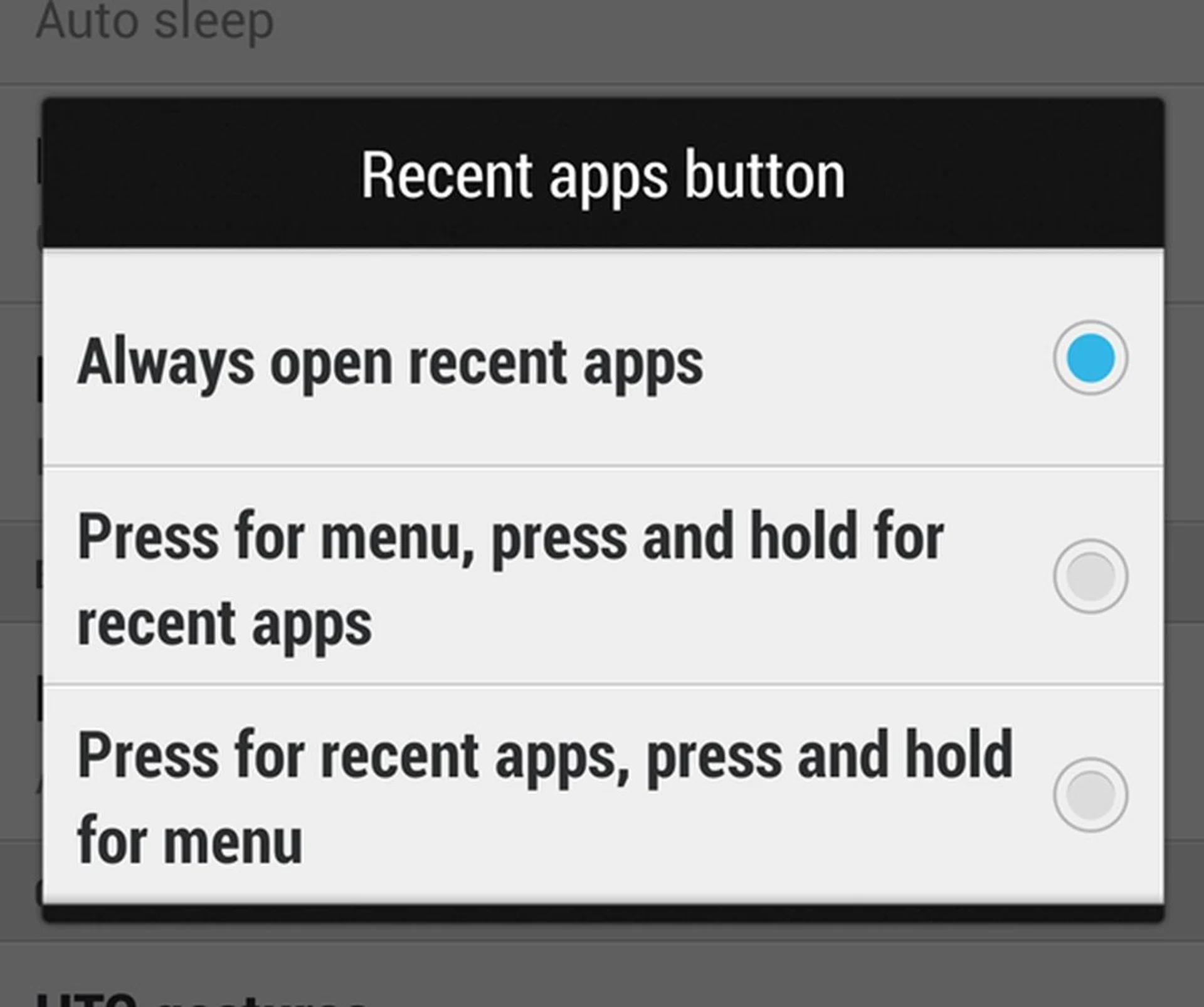 The touch screen menu button, first seen on the HTC One X, reappeared on the HTC One due to the two-button layout. The problem with the touch screen menu button is that it takes up a portion of the screen real estate and looks out of place at the bottom of the screen. HTC addressed this issue with the OTA update by allowing you to customize the function of the Recent Apps button.
