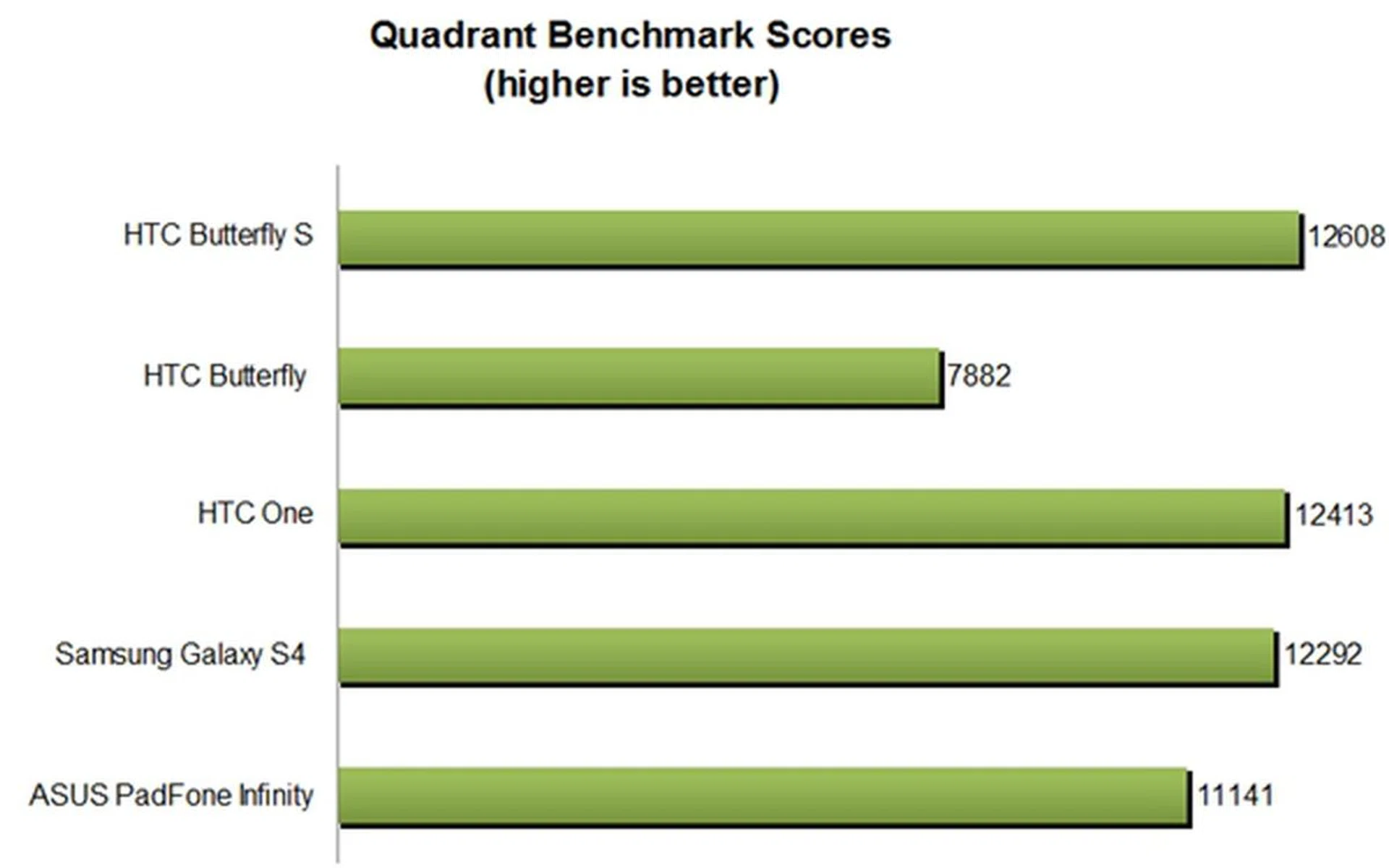 To find out how HTC's latest offering fare against the competition, we use the Quadrant benchmark which evaluates the CPU, memory, I/O and 3D graphics of Android devices. In this comparison, we pit the Butterfly S against the HTC One, the Butterfly, the Samsung Galaxy S4 and ASUS PadFone Infinity.
