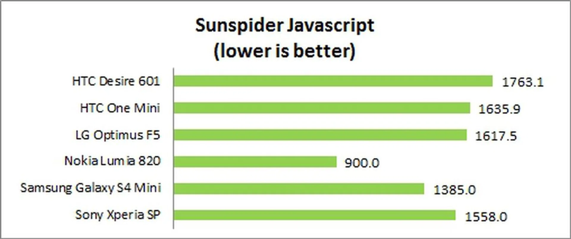 SunSpider Javascript measures the browsing performance of a device. It not only takes into consideration the underlying hardware performance, but also assesses how optimized a particular platform is at delivering a high-speed web browsing experience. With a result of 1763.1, the Desire 601 ranked last in the SunSpider benchmark.