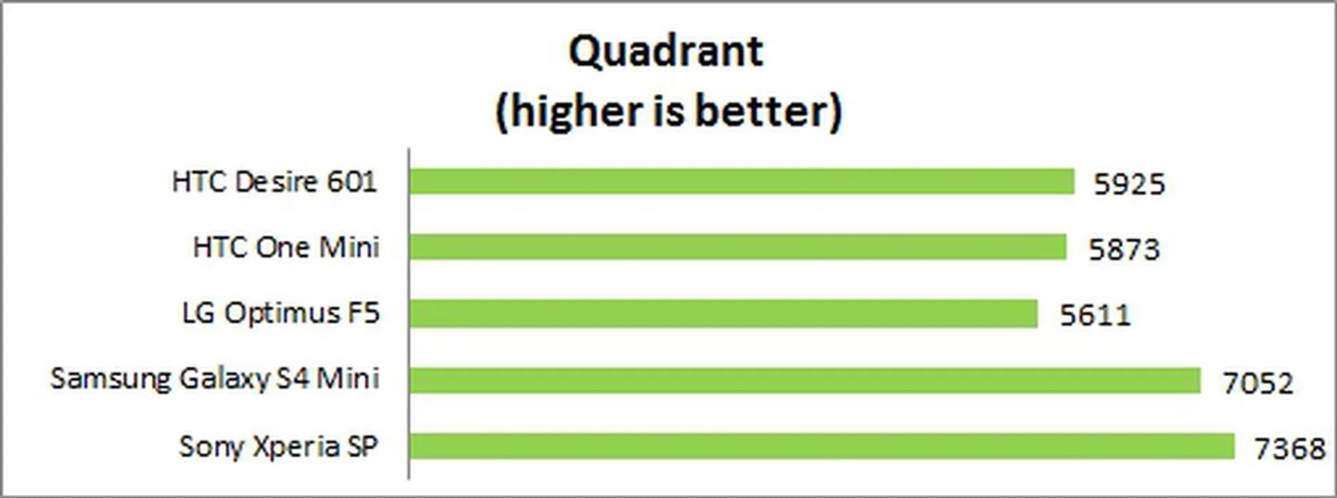 The Desire 601 had a decent score of 5,925 in the Quadrant benchmark, which puts it in the middle of the competition along with the HTC One Mini. Its average performance could be due to the competition's higher clocked processors and perhaps better hardware and software optimizations.