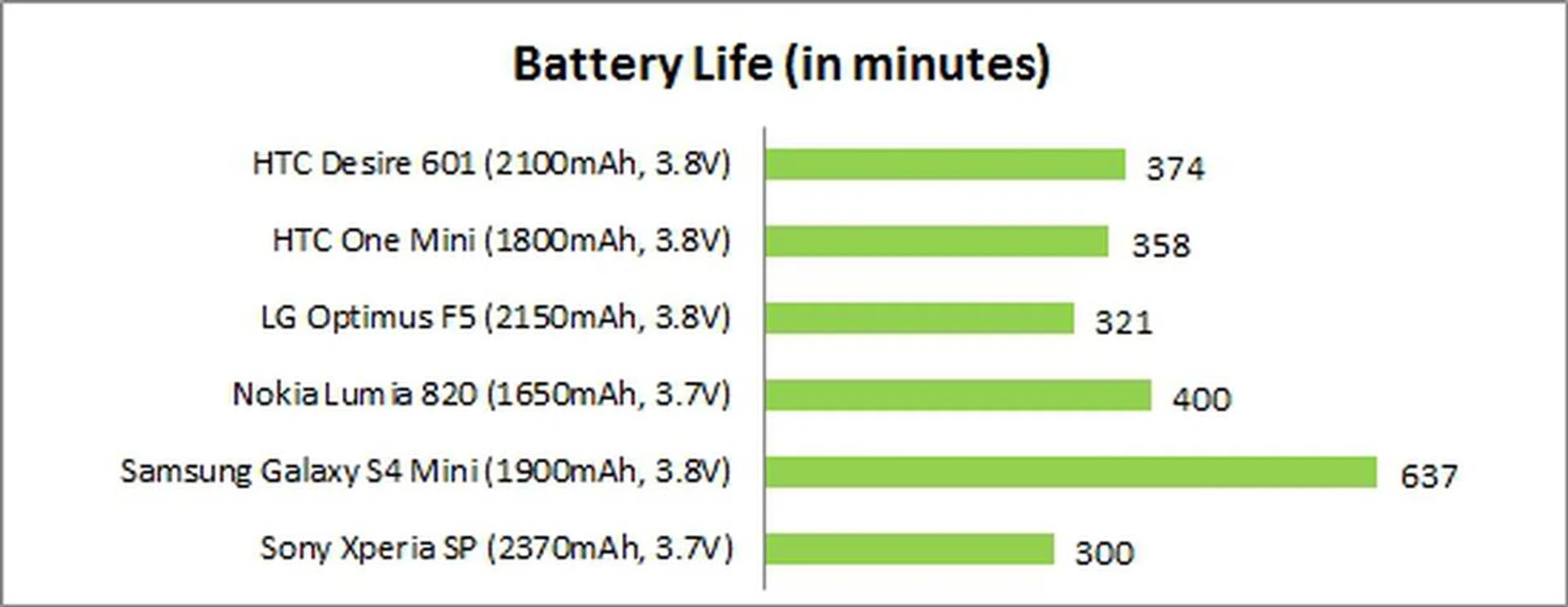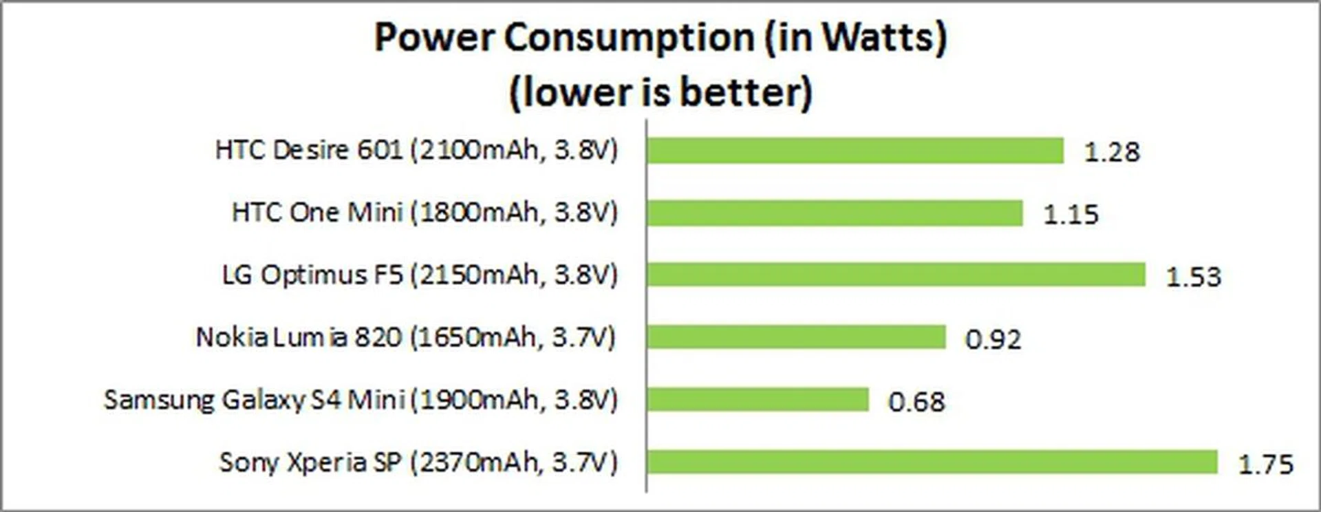 Looking at the Power Consumption chart, the LG and Sony handsets have higher power draw which contributed to the less than expected battery up-time compared to the Desire 601. The Galaxy S4 mini had a low power consumption thanks to its power-efficient AMOLED display which consequently led to its class-leading battery up-time in our media-consumption test scenario. Compared to the HTC One Mini, the Desire 601 had a slightly higher power draw and it's likely due to the larger 4.5-inch screen.