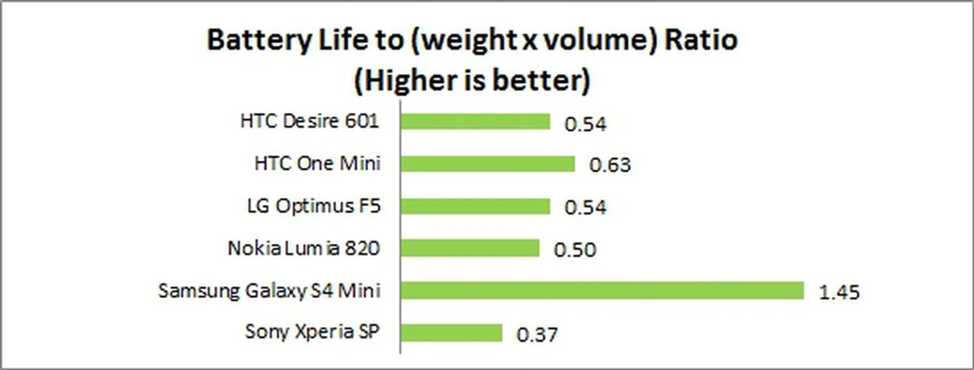 In the Portability Index where each device is assessed on its ability to balance battery mileage against its size and mass, the HTC Desire 601 loses out slightly to the HTC One Mini as the latter phone is slimmer, more compact and is lighter. Interestingly, the Desire 601 and Optimus F5 tied in this comparison even though the Desire 601 had a much better battery life. This goes to show the Optimus F5 has a more favorable form factor and weight to vie for the same spot.