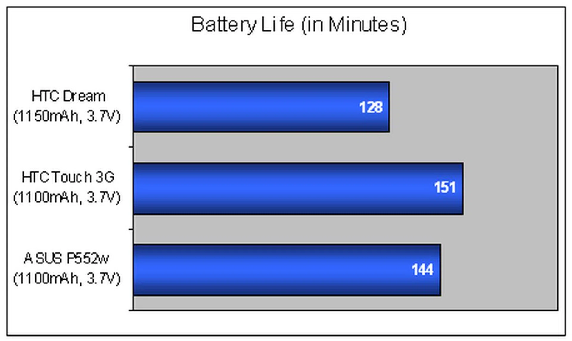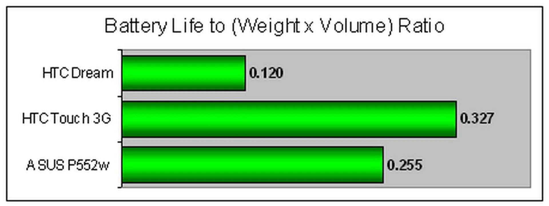 Consider the fact that the Dream utilizes a HVGA screen that can bring its performance level down slightly a notch (compared to both the Touch 3G and the ASUS P552W which is on QVGA screen) and you might understand the sharp dip in its power resources. This will also affect its portability index, seeing as how the lower battery life, coupled with the slightly thicker dimensions, will push the Dream's ratio much lower than other devices.