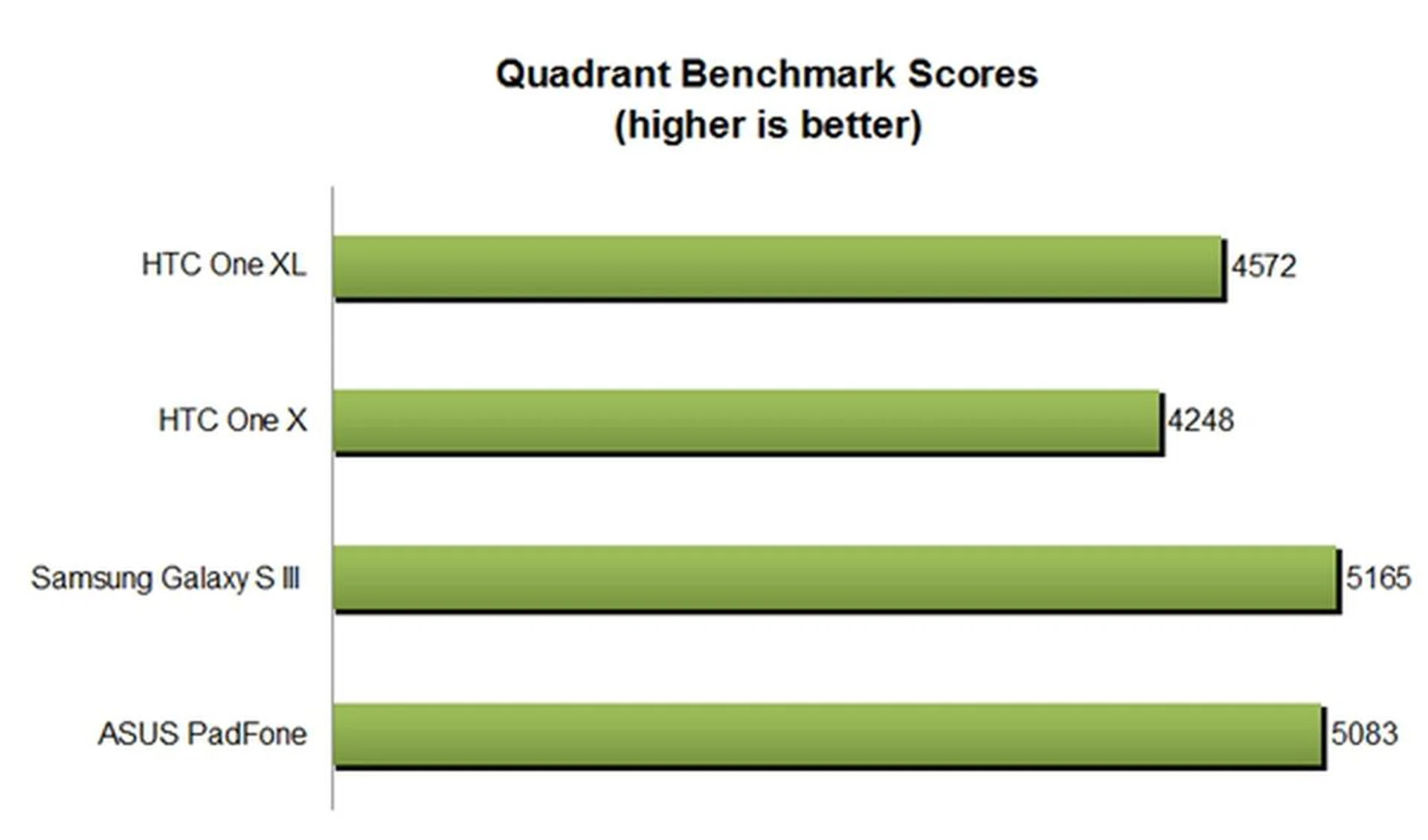 As expected from our review of the ASUS PadFone, the HTC One XL fared better than the One X in the Quadrant benchmark thanks to the newer processor architecture design. However, the discerning reader will notice something amiss: the ASUS PadFone has a better score than the One XL even though both phones are powered by the same processor, 1GB of RAM and Android 4.0. Well, it's not hard to piece together the puzzle.