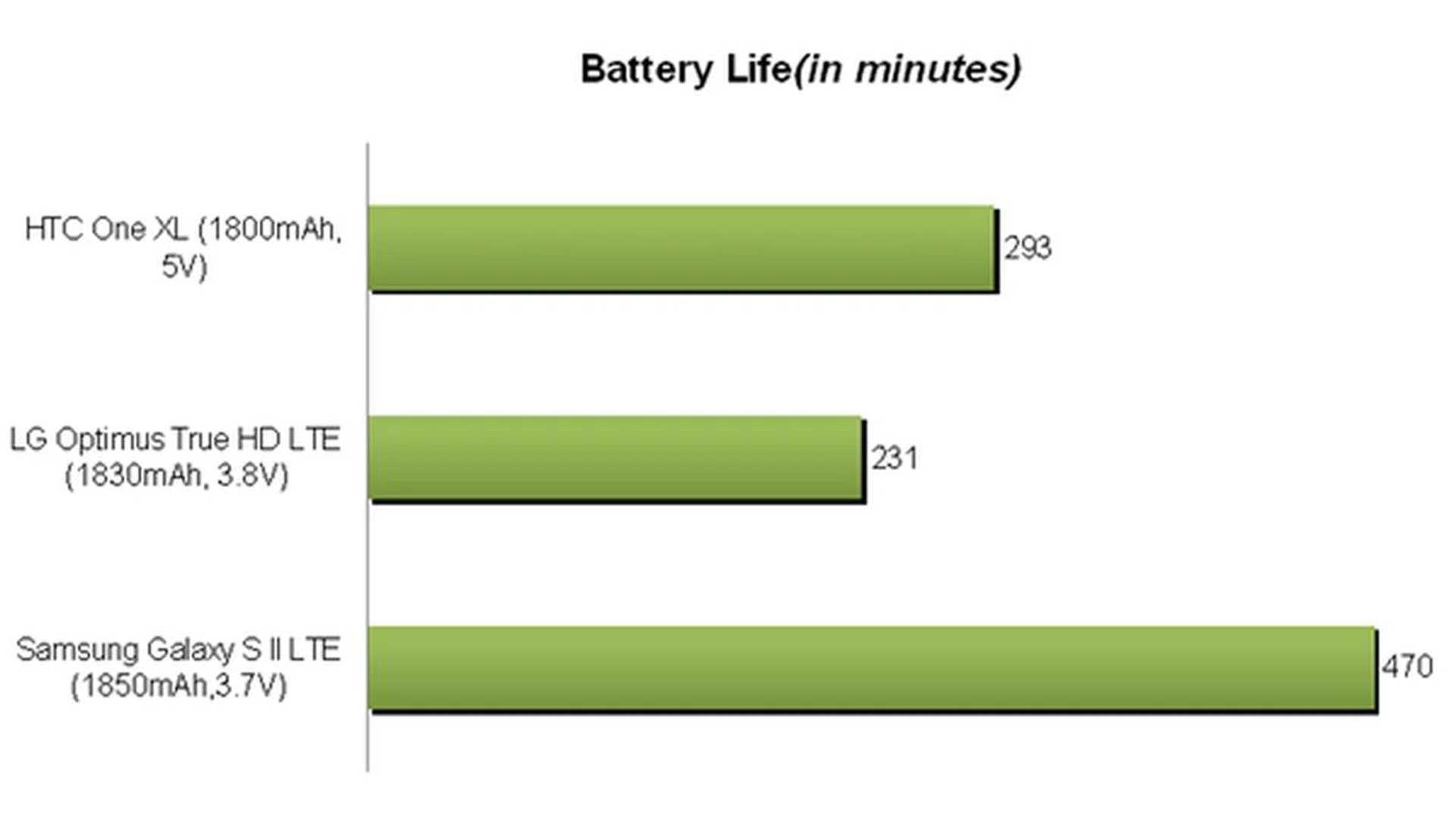 The Samsung Galaxy S II LTE lasted the longest at 7 hours and 50 minutes, followed by the HTC One XL at 4 hours and 43 minutes. Taking into account the minor differences in battery capacities and screen sizes, Samsung probably did a better job at optimizing power management on the Galaxy S II LTE. The power-efficient nature of AMOLED displays also plays a part here.