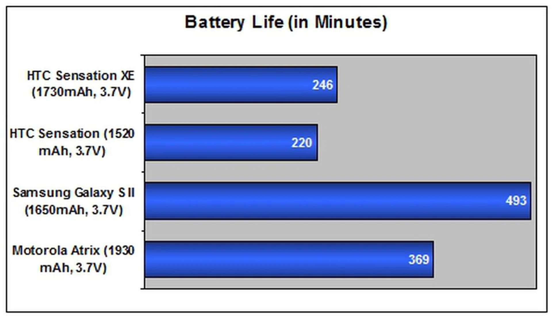 The final test we performed on the Sensation XE was to check on its battery stamina with a selected group of devices chosen based on their similarities across battery capacities, display sizes, resolution and processing power. Our testing methodology involves test video with a 480 x 800 pixels resolution looping under the following conditions: