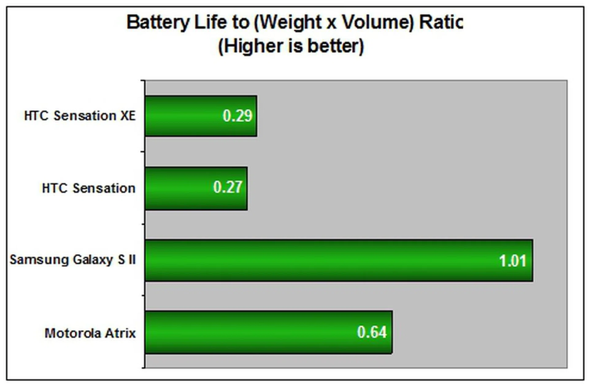 As listed in the specifications, the HTC Sensation XE comes with a higher 1730mAh battery capacity, slightly higher than the original Sensation's 1520mAh. This results in a 26-minute advantage as shown in our battery test, which isn't exactly spectacular. The smartphone's battery life is still roughly half of the Samsung Galaxy S II, which is unsurprising, given that the smartphone remains greatly unchanged from its predecessor. The Sensation XE's higher battery capacity offsets its higher level of power consumption due to its more powerful (hence, more battery-consuming) 1.5GHz dual-core processor which explains why its power consumption is slightly higher at 1.56W compared to the Sensation. Due to its higher battery life and almost identical volume and weight (the Sensation XE is only 3g heavier than the Sensation), the smartphone gains an upper hand over its predecessor in the portability index. However, comparing it to the other dual-core smartphones in the line-up, the Sensation XE falls short like the Sensation due to its heavier body and bigger girth.