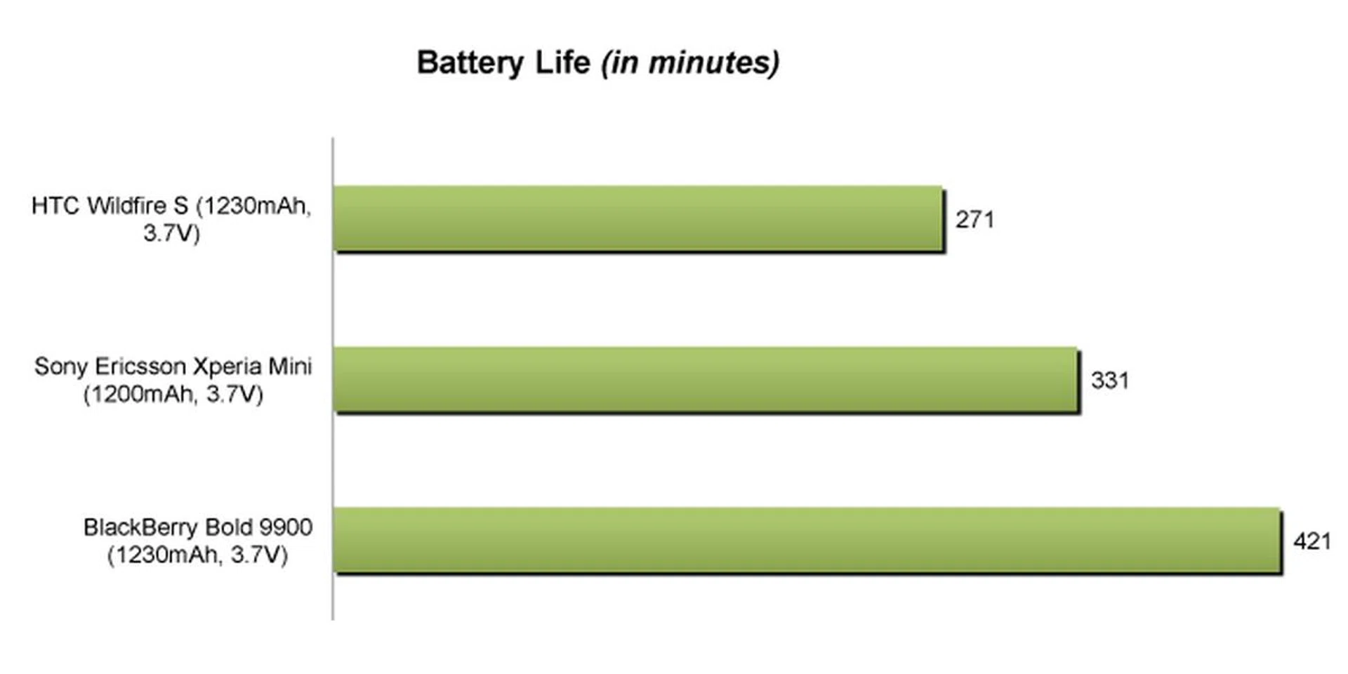 Considering how the Xperia Mini and Bold 9900 come with a smaller screen size than the Wildfire S, some might say the higher mileage on both devices can be easily explained. But you have to consider that the Wildfire S utilizes a Qualcomm Snapdragon single-core processor clocked at 600MHz, whilst the Xperia Mini runs at 1GHz and the Bold 9900 adopts a 1.2GHz clock speed. HTC’s Sense UI might have made the experience much more intuitive, but it is also most likely a power hog that resulted in these figures.
